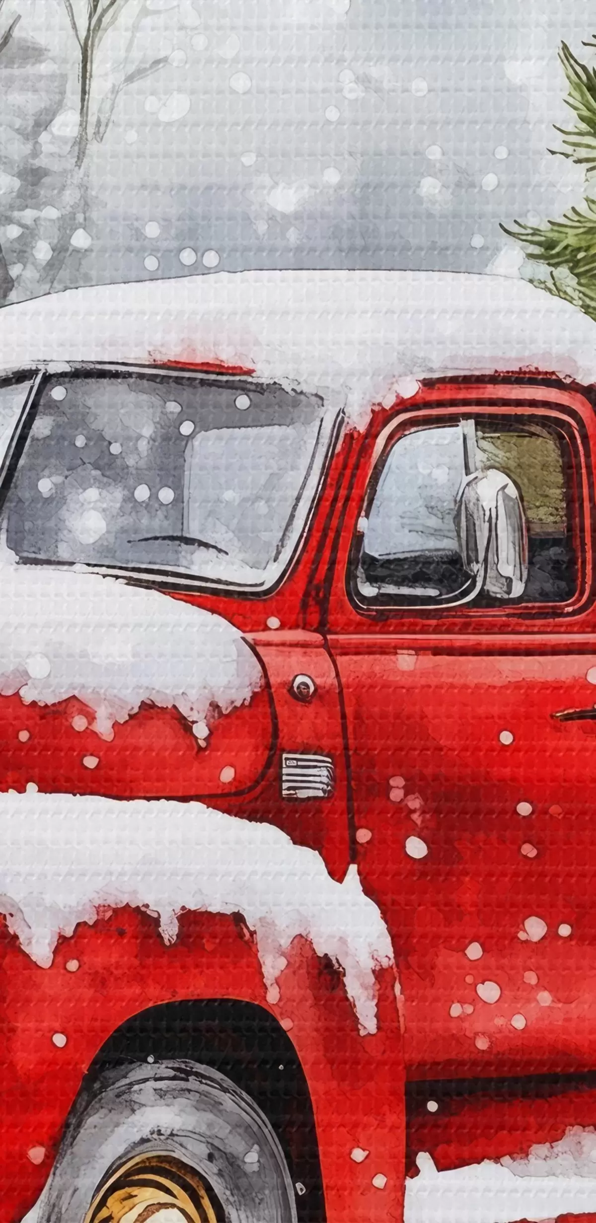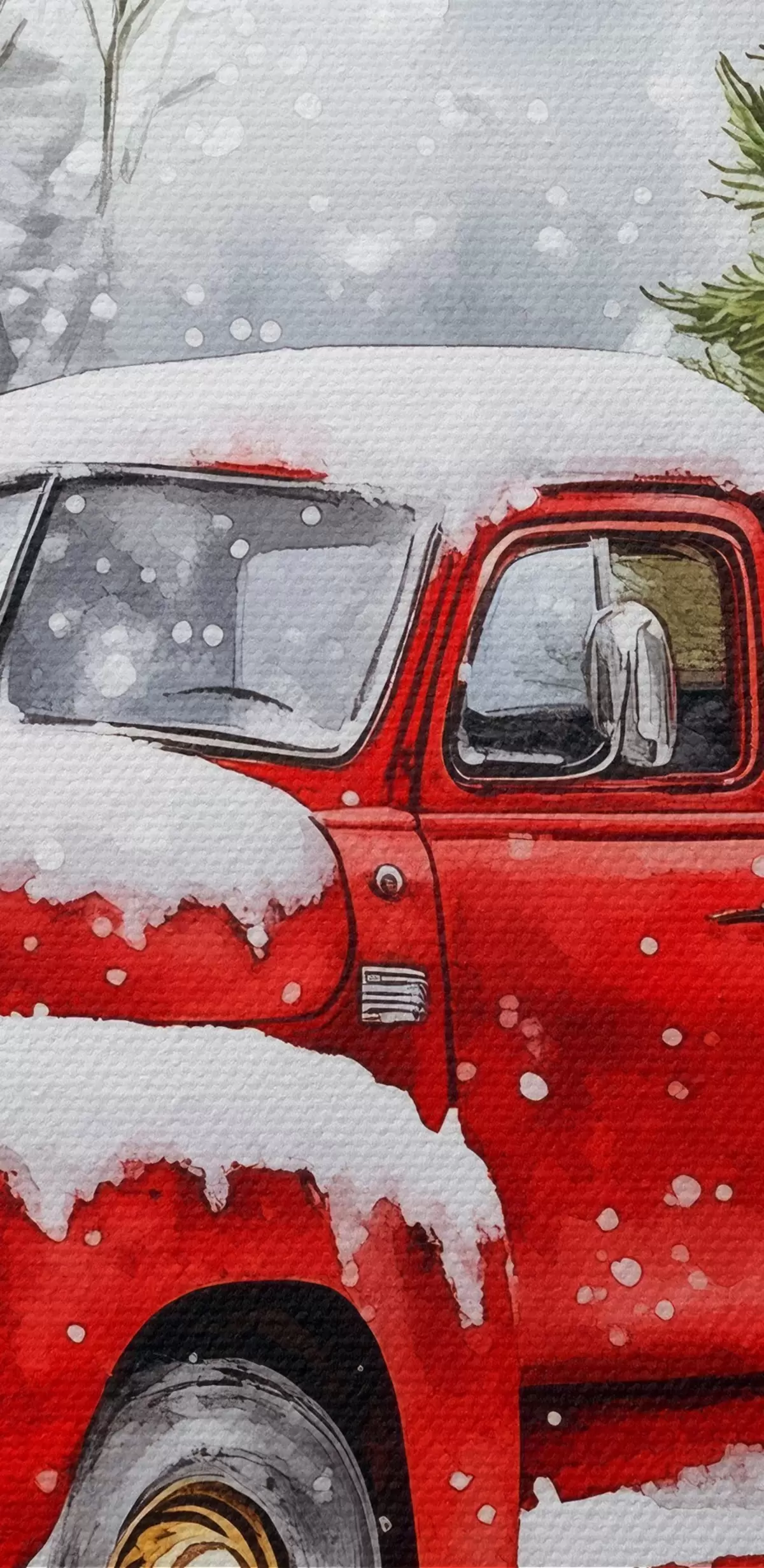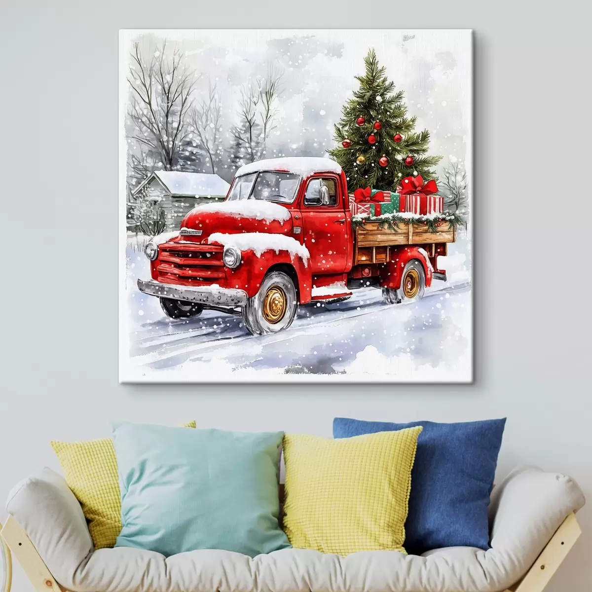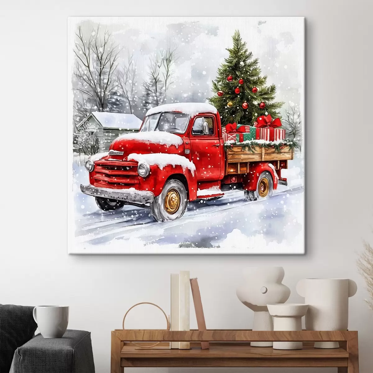 Obraz Świąteczny samochód z choinką i prezentami w śnieżną pogodę Nr s41968