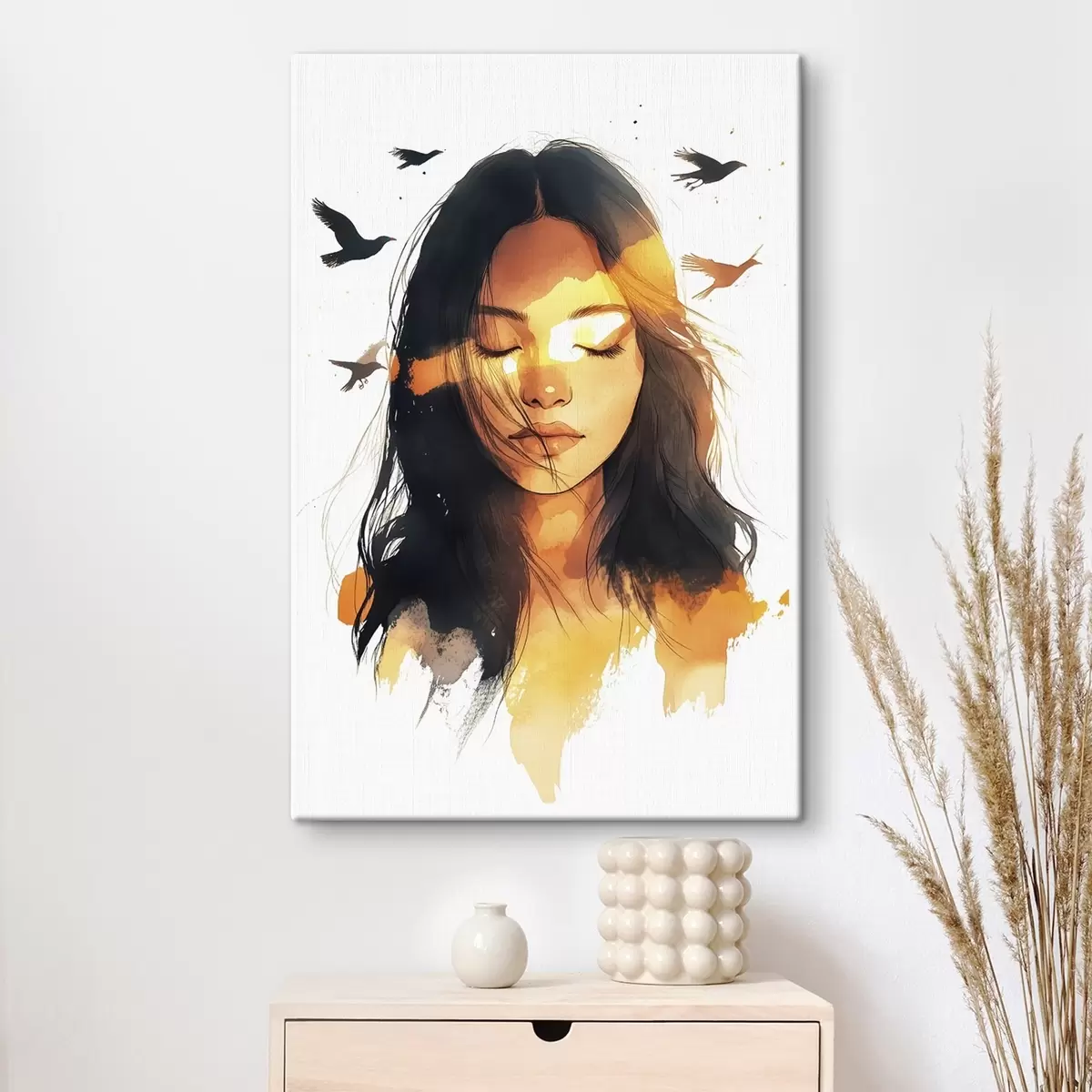 Obraz Portret w stylu akwareli, piękna dziewczyna, światło słoneczne, latające ptaki s42198