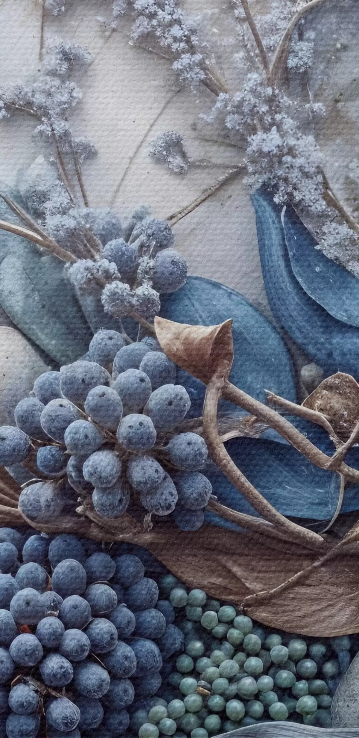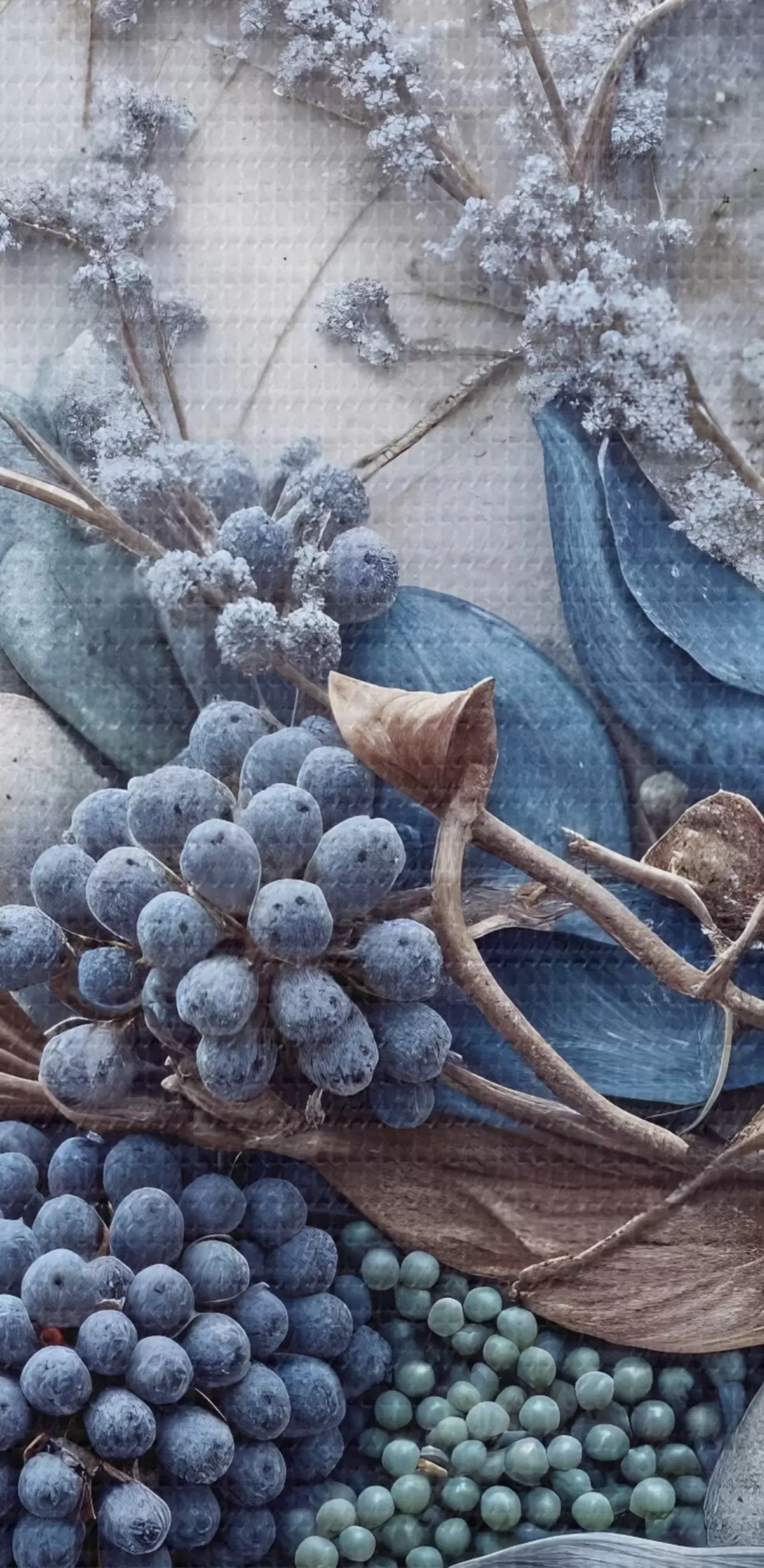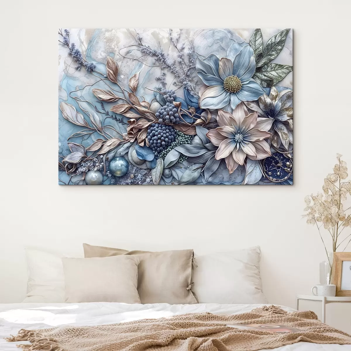 Obraz Szczegółowo teksturowane abstrakcyjne bujne kwiaty z dużymi, żywymi niebieskimi i różowymi kwiatami, jagodami i innymi elementami botanicznymi Nr s42210
