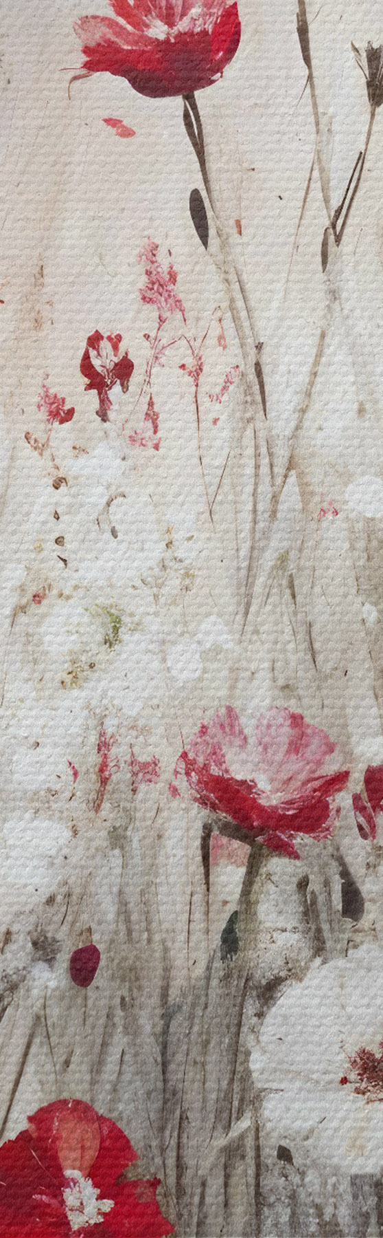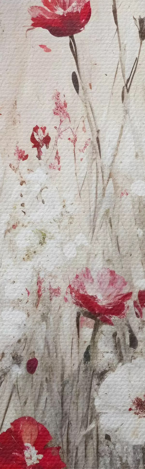 Obraz Abstrakcyjna imitacja obrazu olejnego z polem czerwonych i białych maków i stokrotek na szarym, teksturowanym tle Nr s42213