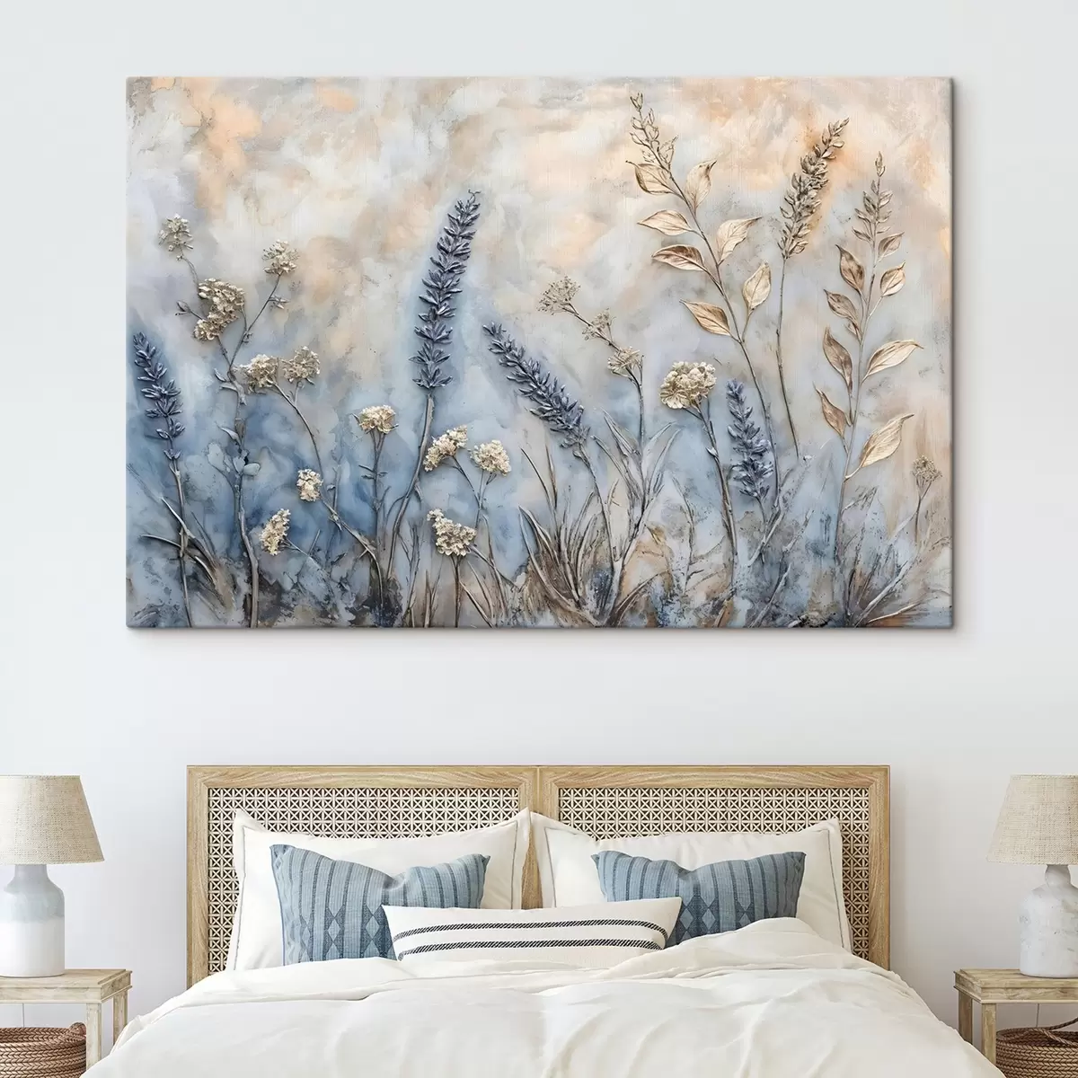 Obraz Pole różnych polnych kwiatów i roślin w odcieniach niebieskiego, białego i beżowego na miękkim, zamglonym tle Nr s42214