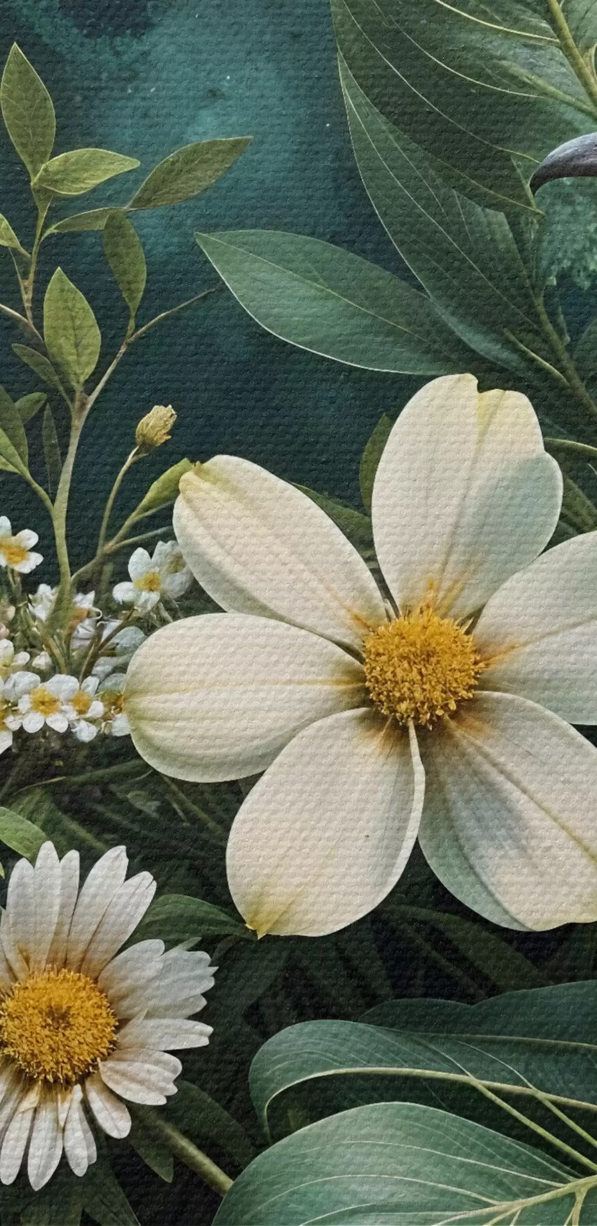 Obraz Małe ptaki siedzące na gałęziach otoczone bujnymi tropikalnymi liśćmi, w tym dużymi zielonymi liśćmi i kolorowymi kwiatami Nr s42220