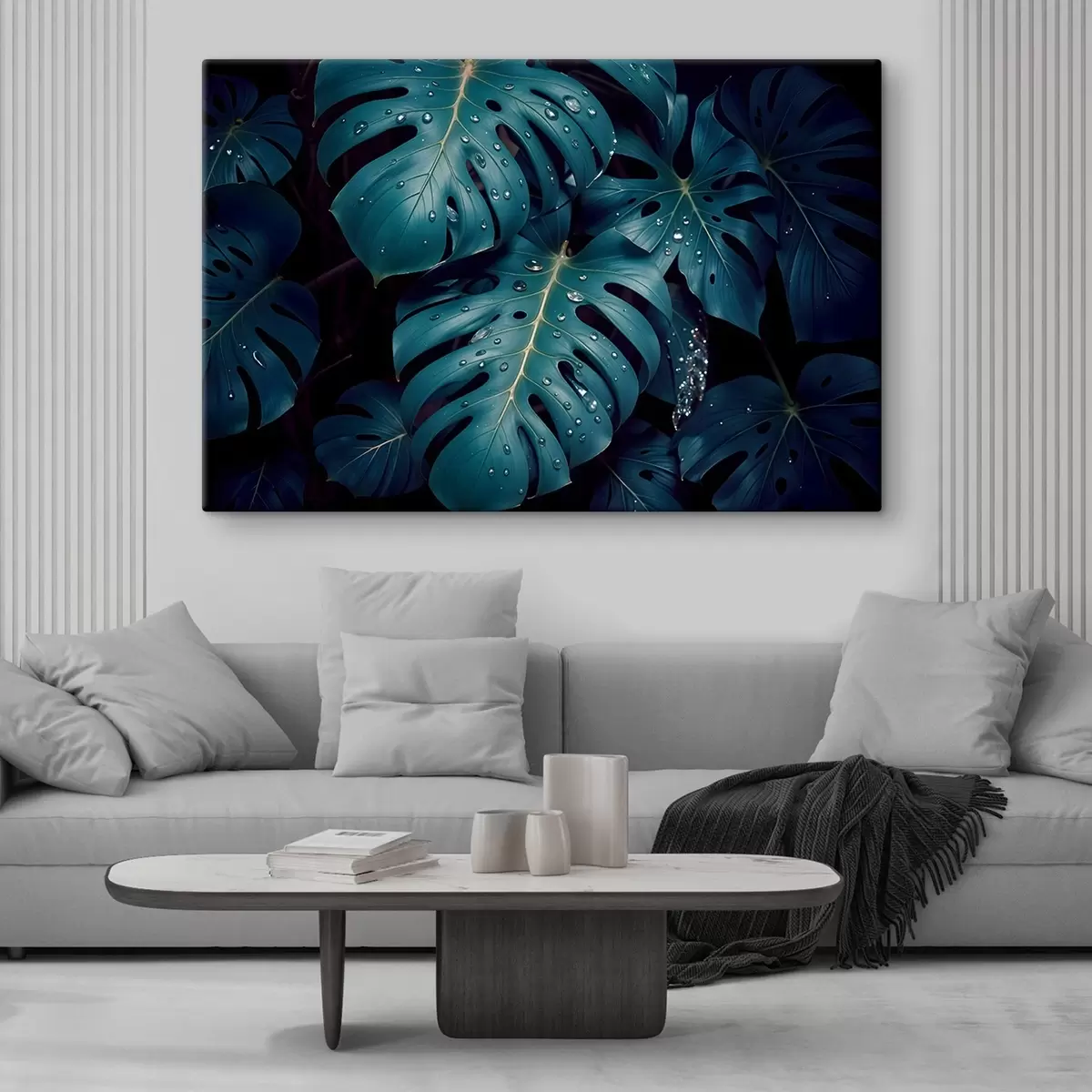 Obraz Bujne tropikalne liście monstery z kroplami wody na ciemnym tle, tworzące nastrojowy i klimatyczny nadruk Nr s42233