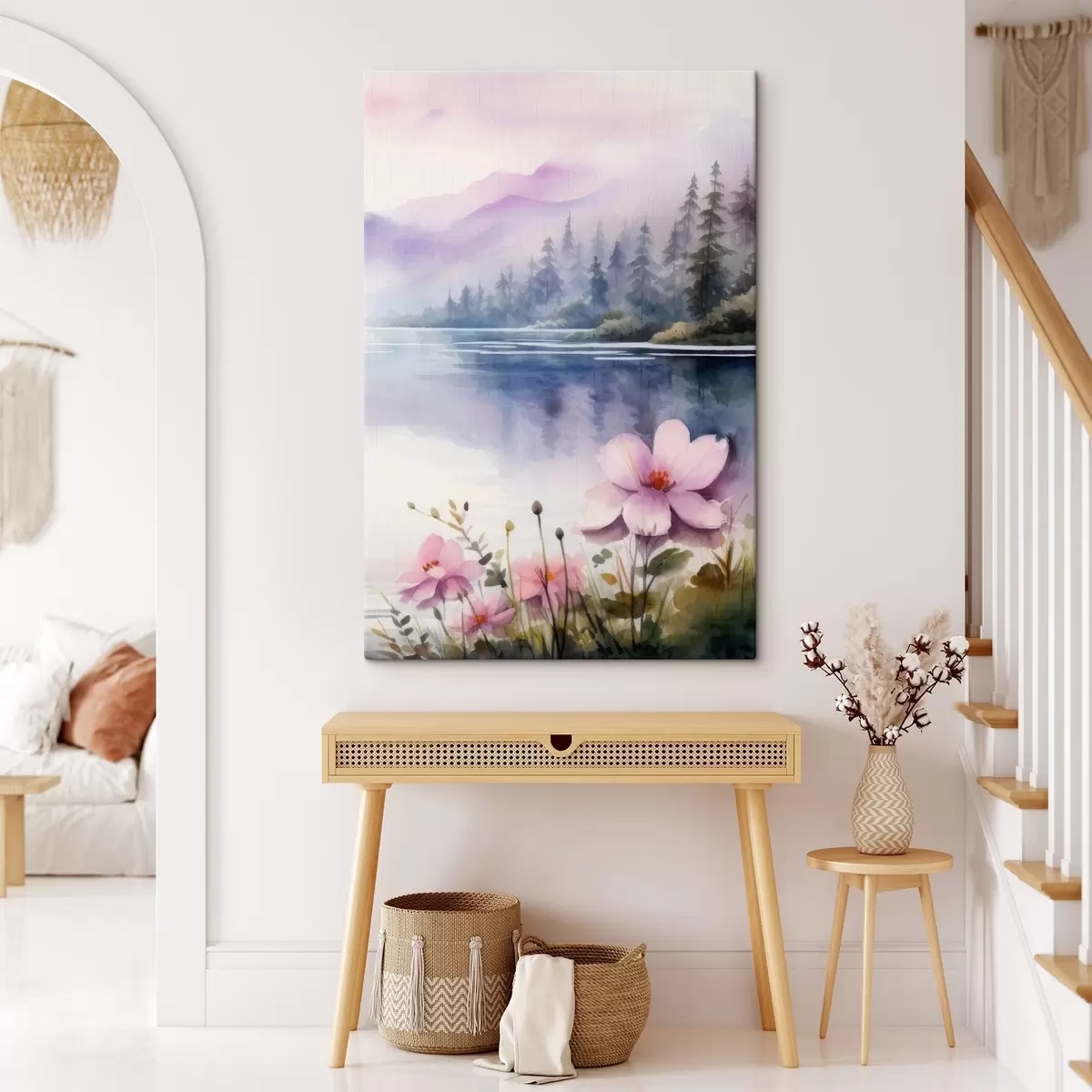 Obraz Różowe kwiaty na tle jeziora w górach Nr s42393