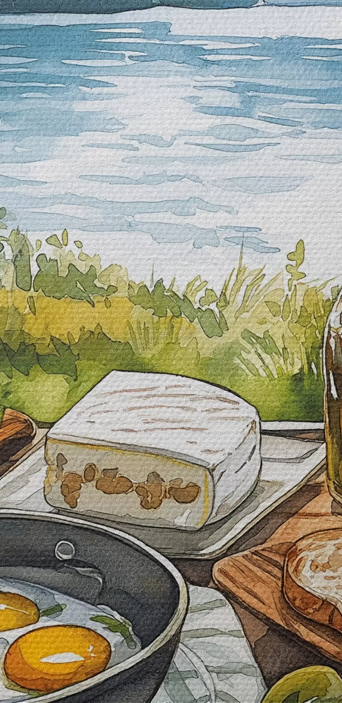 Obraz Estetyka kempingu, styl akwareli, letnie jezioro, natura, jedzenie Nr s42428