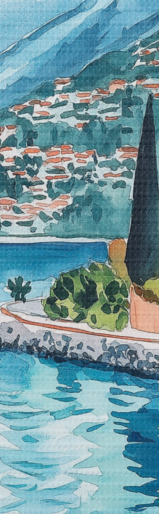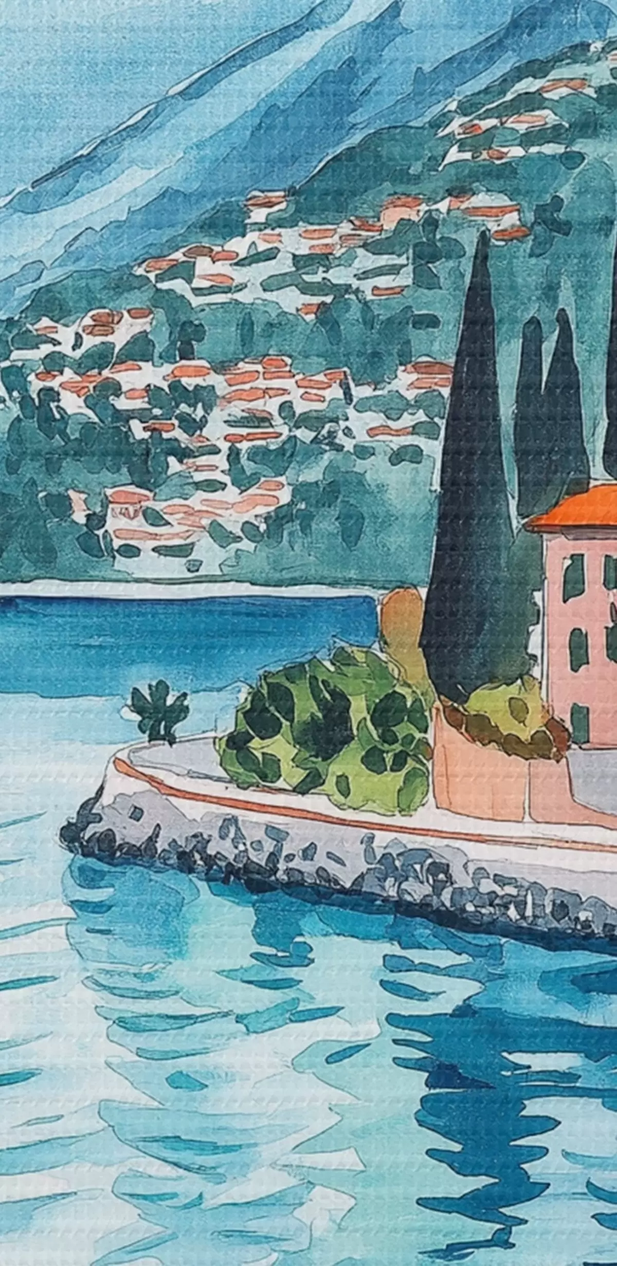 Obraz Jezioro Como, Włochy, styl akwareli, pizza, koktajle, stare miasto, góry Nr s42437