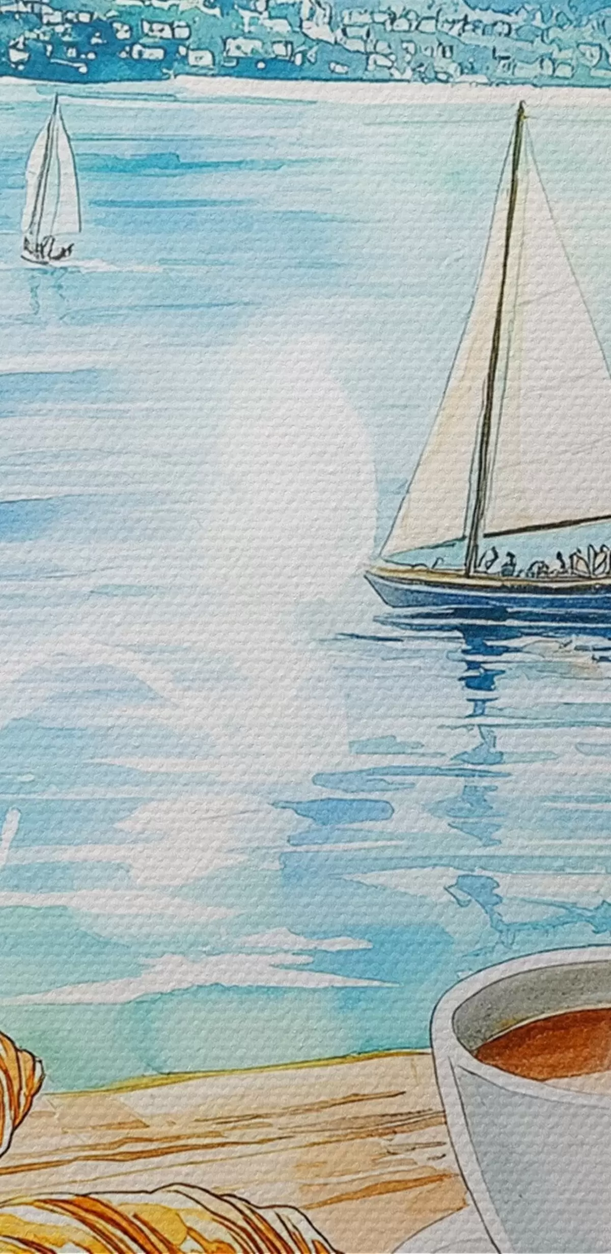 Obraz Letnie jezioro z żaglówkami, filiżankami kawy, rogalikami, styl akwareli Nr s42441