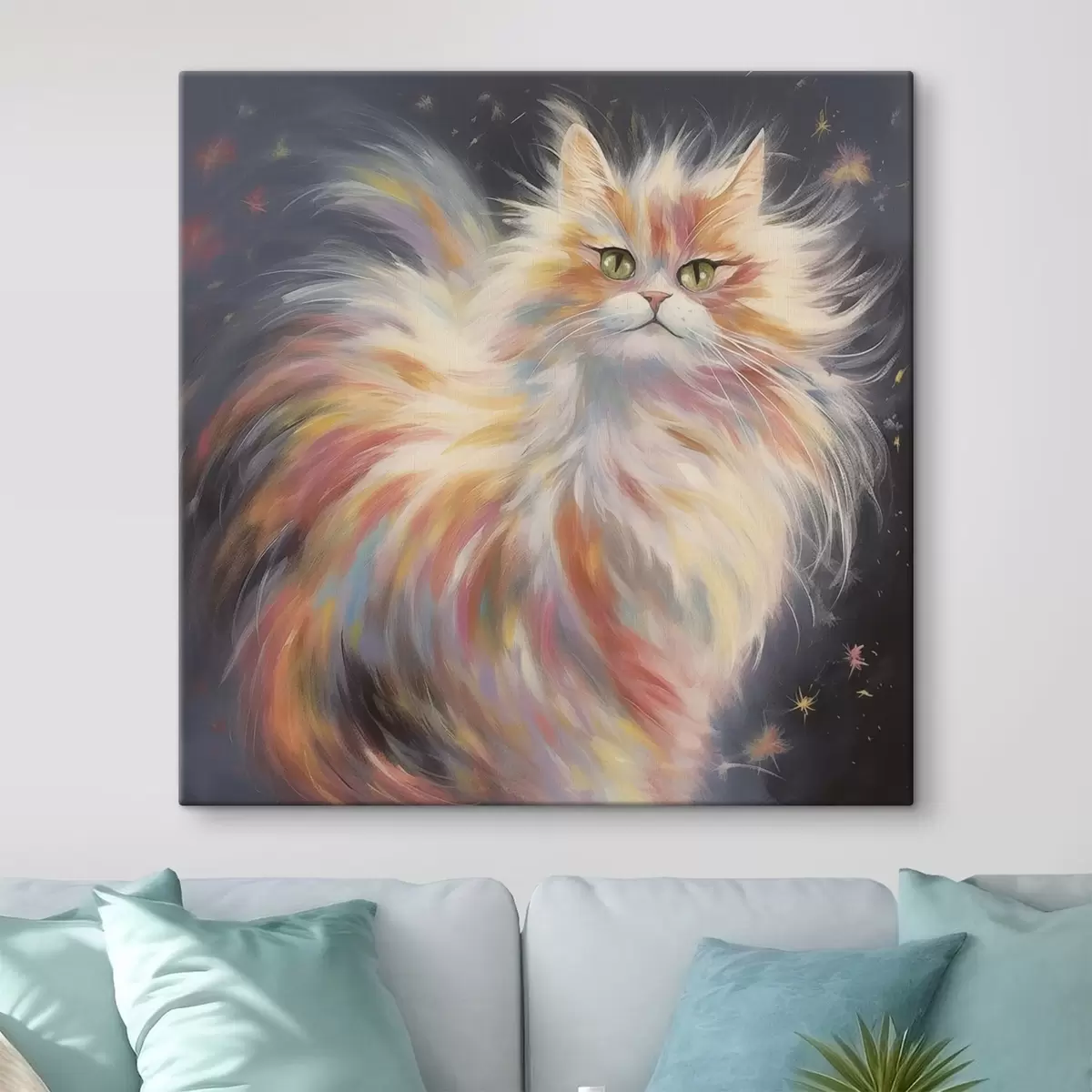 Obraz Puszysty kot z kolorowym futrem na ciemnym tle Nr s42484