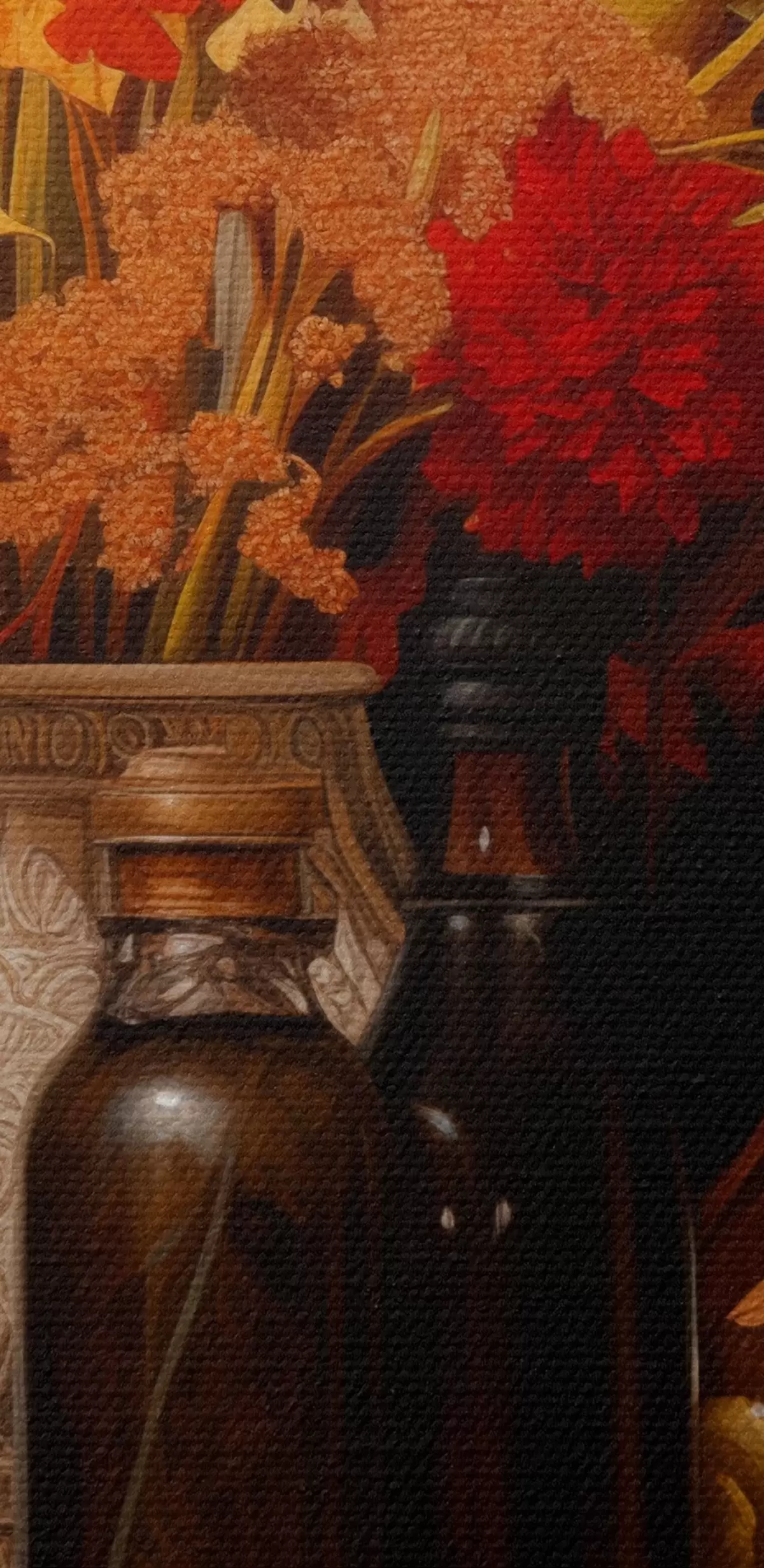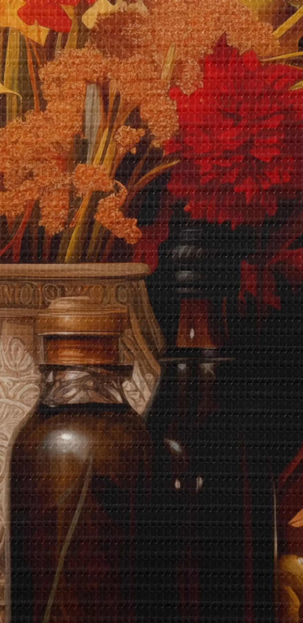Obraz Jesienna martwa natura z bukietem w ciepłych odcieniach pomarańczy i czerwieni, jabłkami, winogronami, książkami i ceramicznymi naczyniami na ciemnym tle. s42561