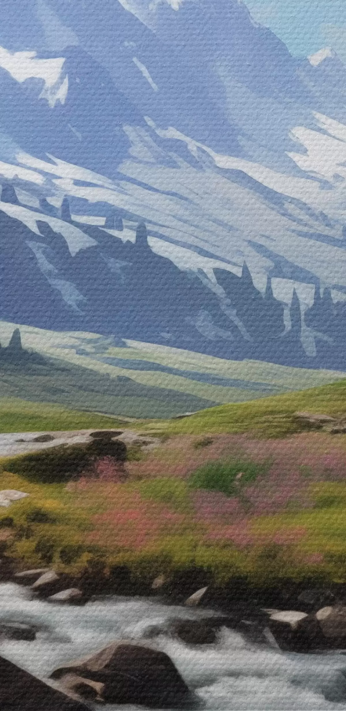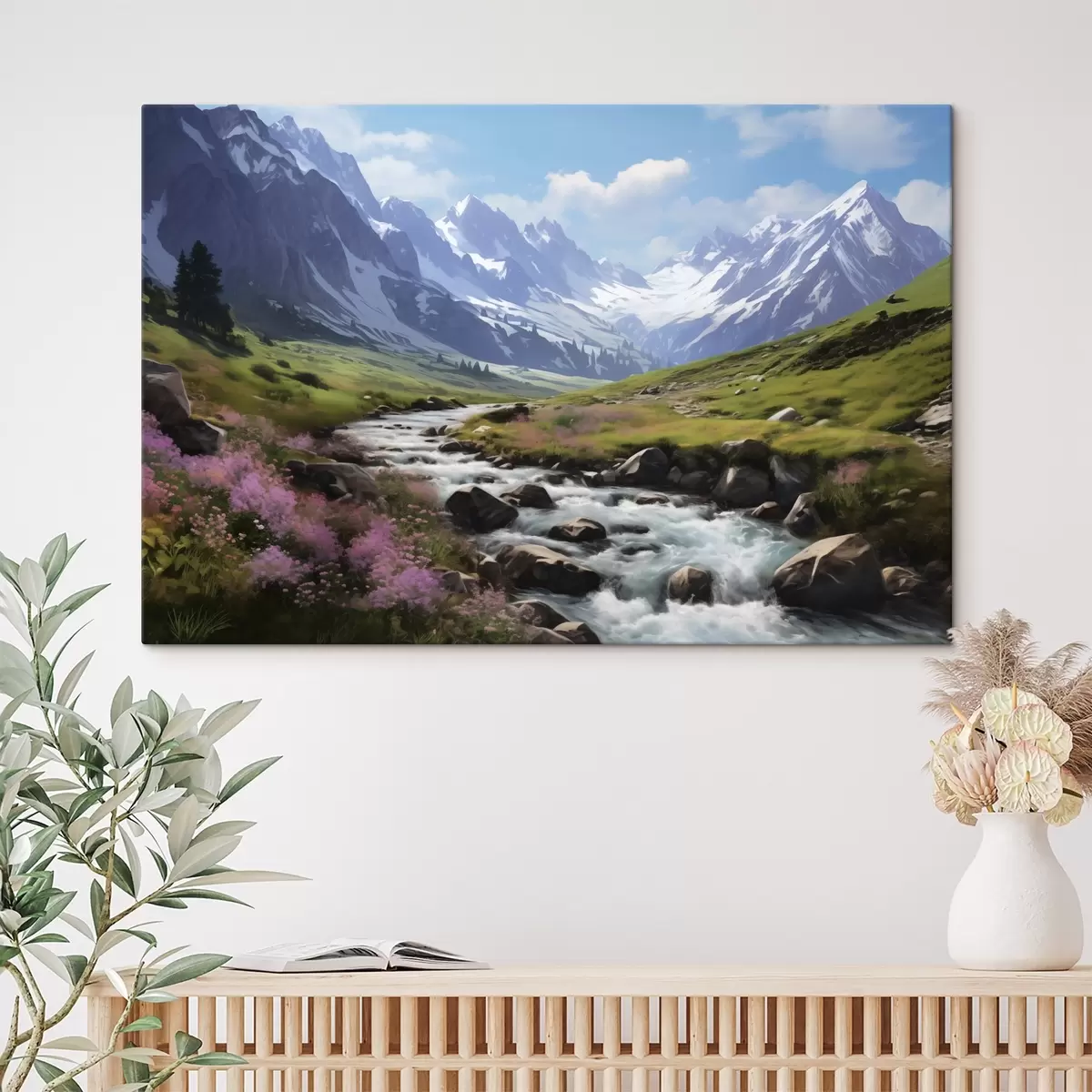 Obraz Górski krajobraz z rwącym potokiem, kwitnącymi łąkami i ośnieżonymi szczytami na horyzoncie pod jasnym, błękitnym niebem. s42563