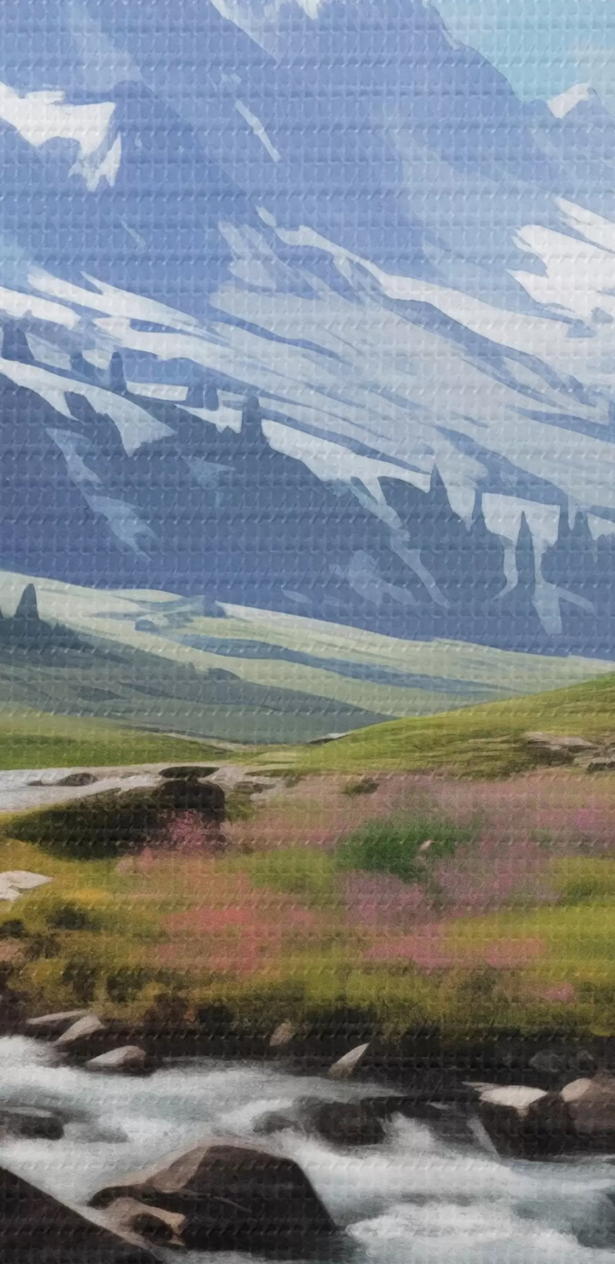 Obraz Górski krajobraz z rwącym potokiem, kwitnącymi łąkami i ośnieżonymi szczytami na horyzoncie pod jasnym, błękitnym niebem. Nr s42563