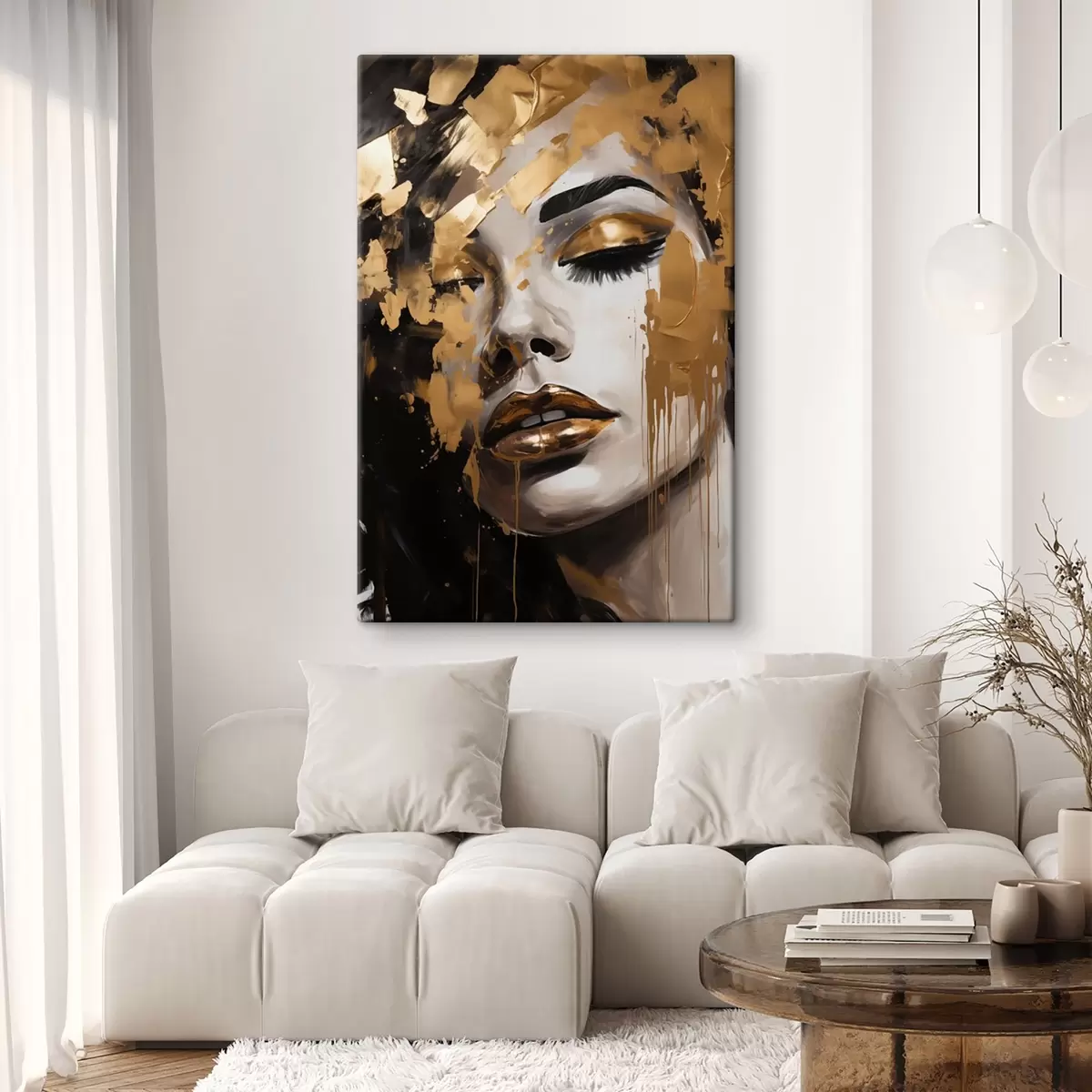 Obraz Abstrakcyjny portret kobiety z bogatymi pociągnięciami pędzla w ciepłych odcieniach, tworzący żywy i dramatyczny obraz. s42619