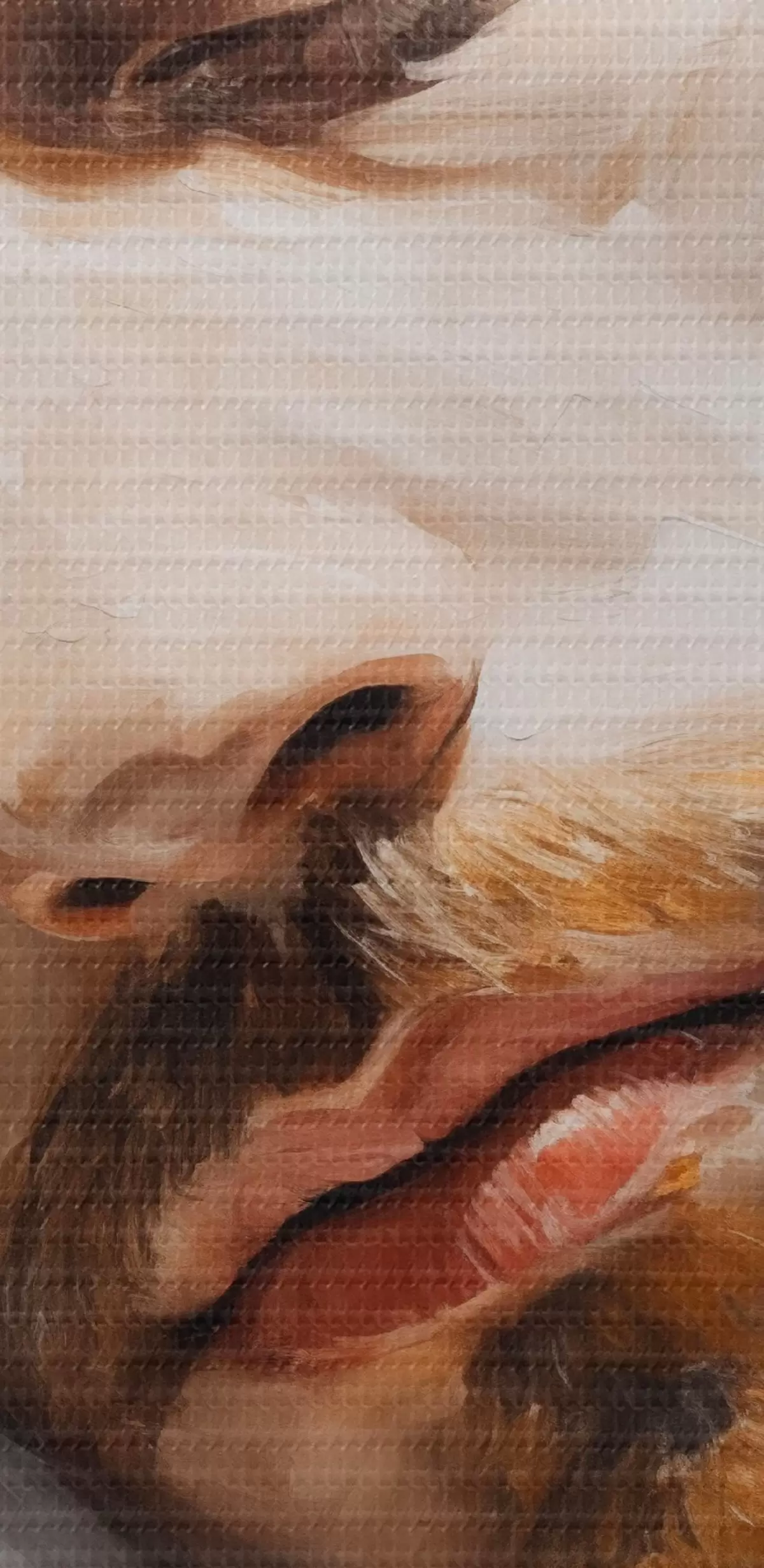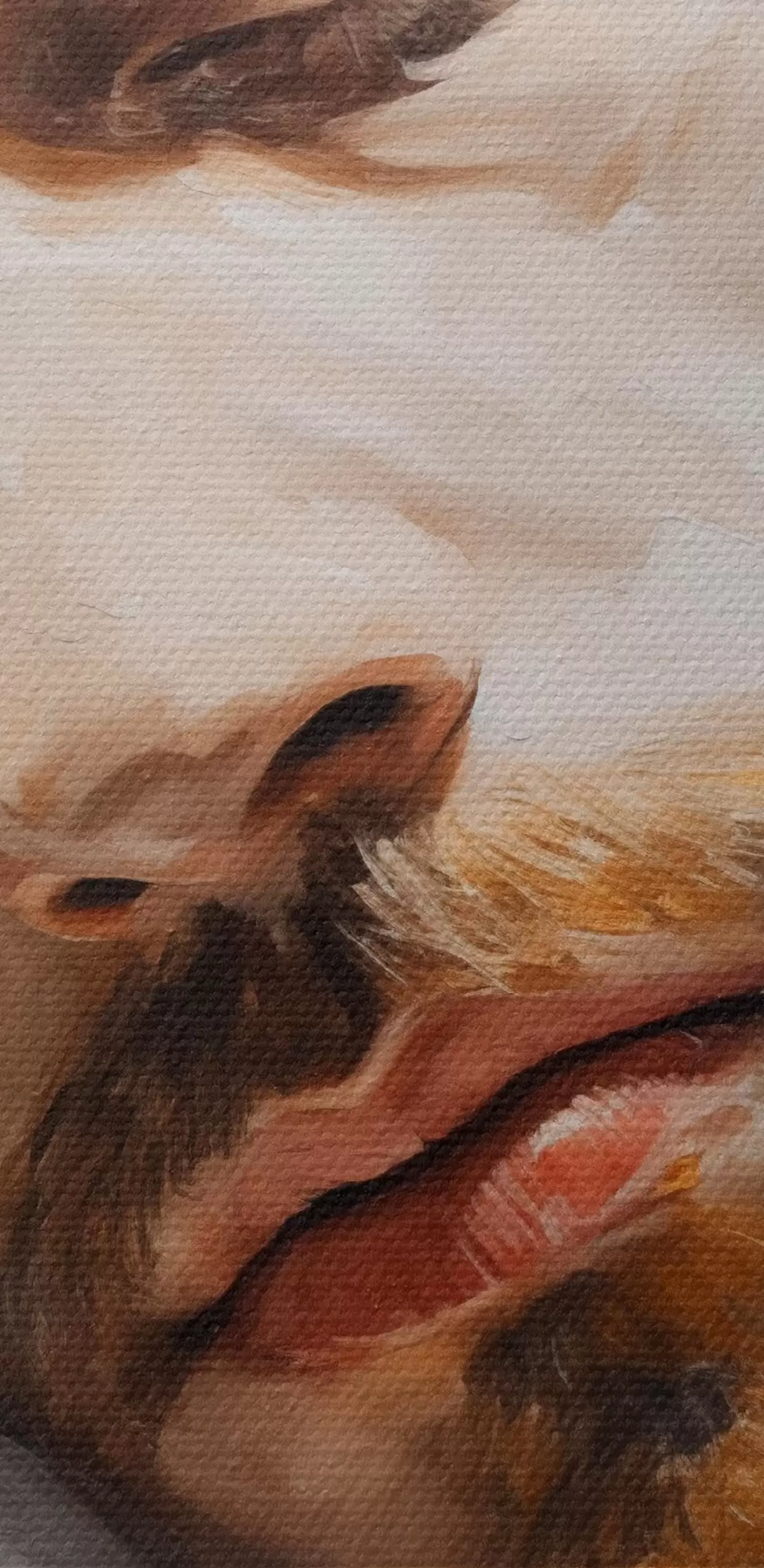 Obraz Abstrakcyjny portret mężczyzny z zamkniętymi oczami, oddany w miękkich, ciepłych odcieniach z gładkimi pociągnięciami pędzla, które wywołują poczucie spokoju. Nr s42621