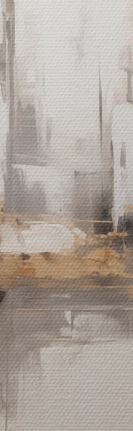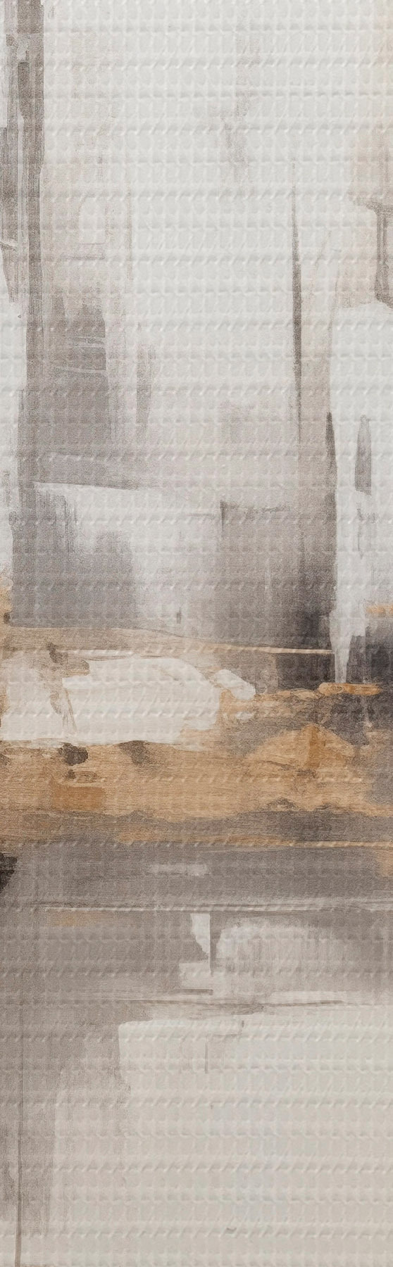Obraz Abstrakcyjny pejzaż miejski z odbiciami budynków w wodzie, stworzony w neutralnych tonach z akcentami ciepłych odcieni. Nr s42628