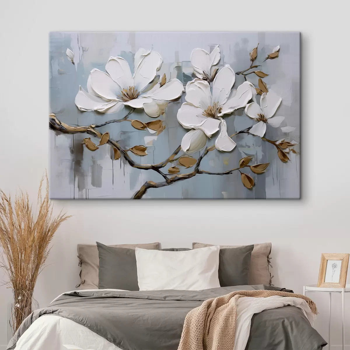 Obraz Białe kwiaty magnolii z teksturowanymi płatkami i brązowymi liśćmi na miękkim niebieskim tle imitacja obrazu olejnego Nr s42711