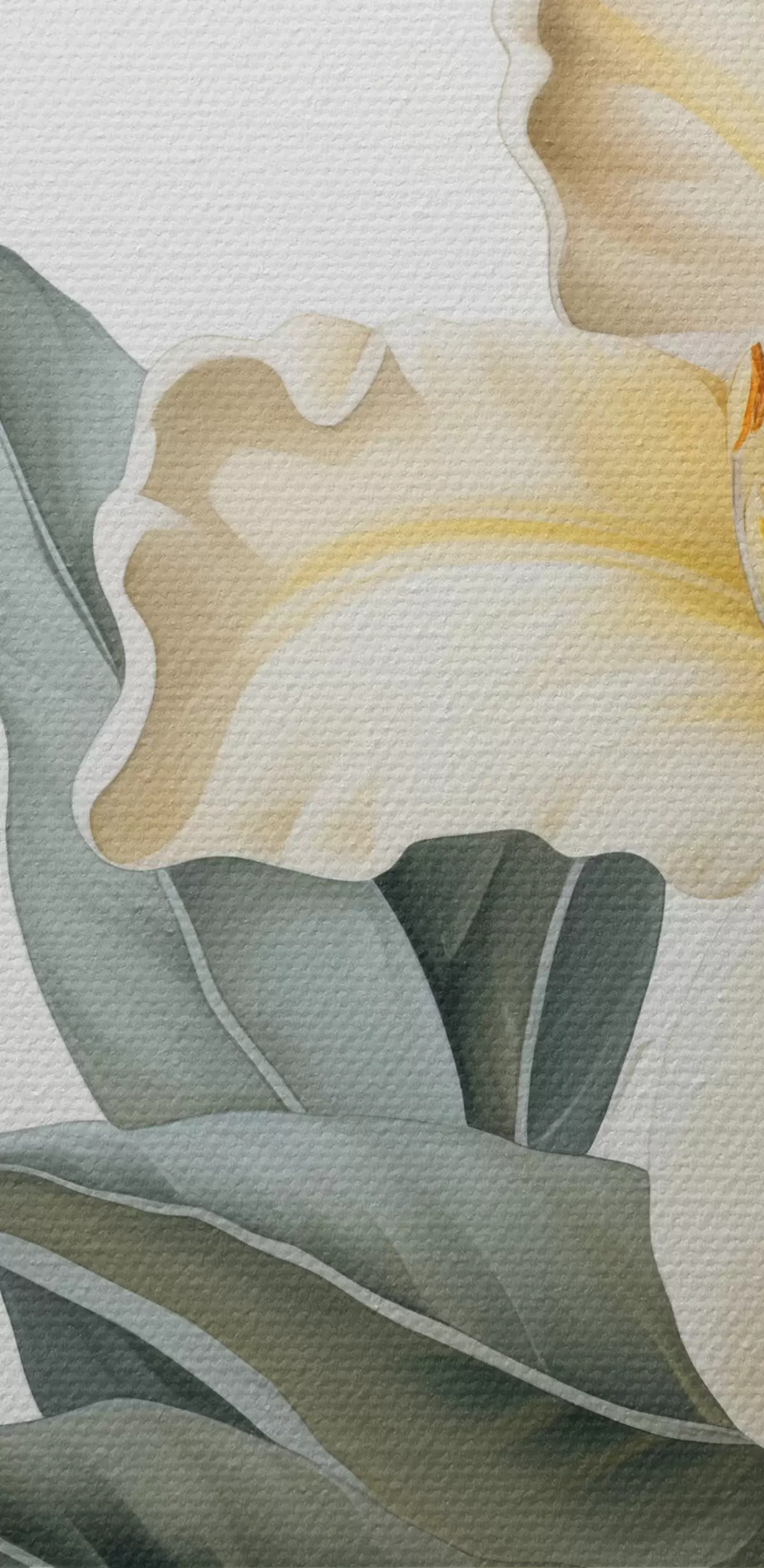 Obraz Botaniczna ilustracja przedstawiająca białe i jasnożółte kwiaty o skomplikowanych płatkach, otoczone zielonymi liśćmi Nr s42712