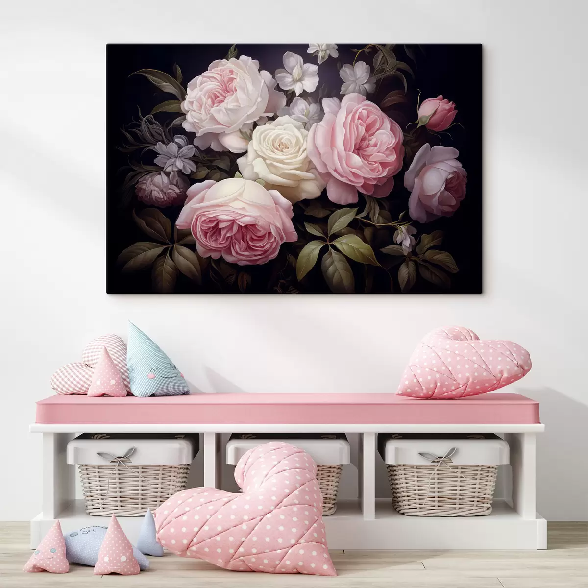 Obraz Różowe i białe róże ułożone z delikatnymi białymi kwiatami i zielonymi liśćmi na ciemnym tle Nr s42721