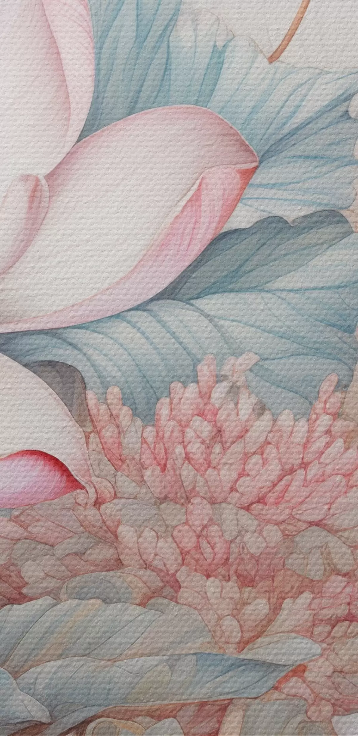 Obraz Duże, kwitnące kwiaty lotosu w delikatnych odcieniach różu i bieli, otoczone zielonymi liśćmi i delikatnymi różowymi listkami Nr s42729