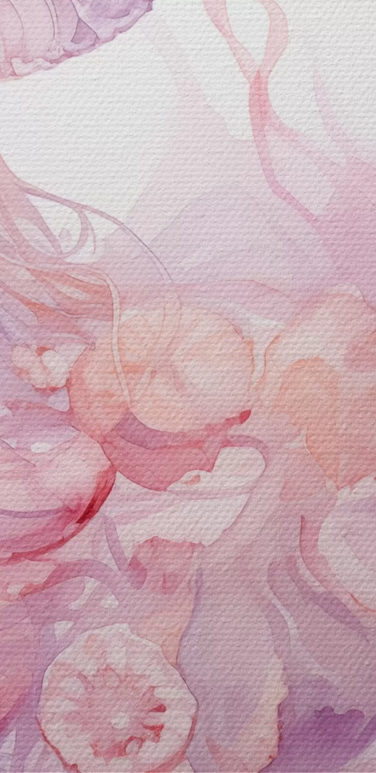 Obraz Różowe meduzy unoszące się pośród wiru delikatnych różowych i fioletowych odcieni, otoczone abstrakcyjnymi kształtami  s42730