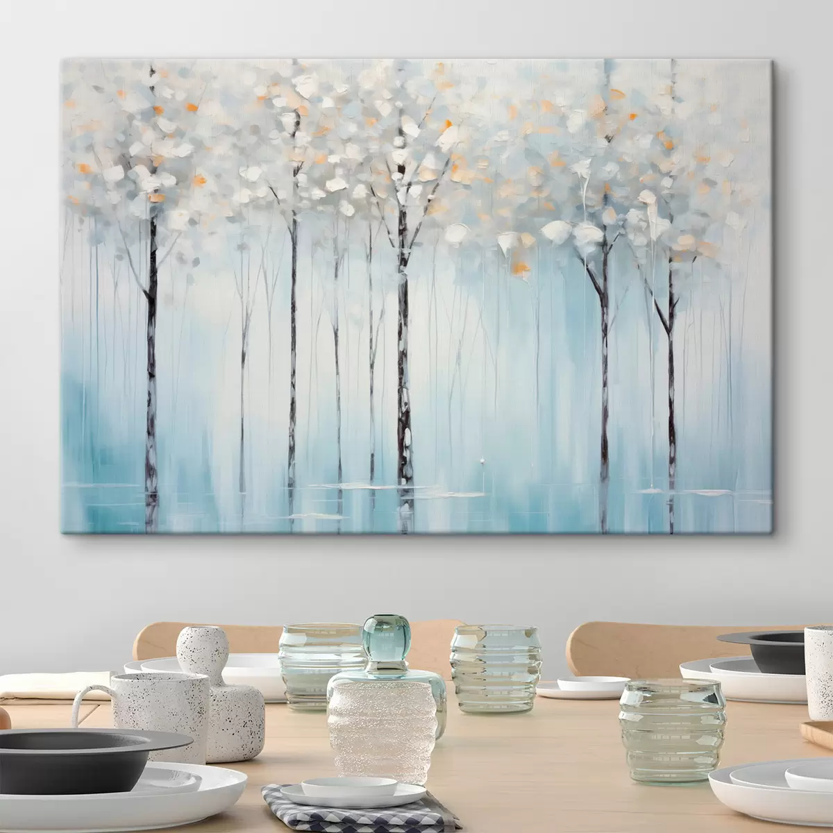 Obraz Wysokie, smukłe drzewa z niebieskimi liśćmi i odcieniami żółci na miękkim niebieskim tle, imitacja obrazu olejnego Nr s42731
