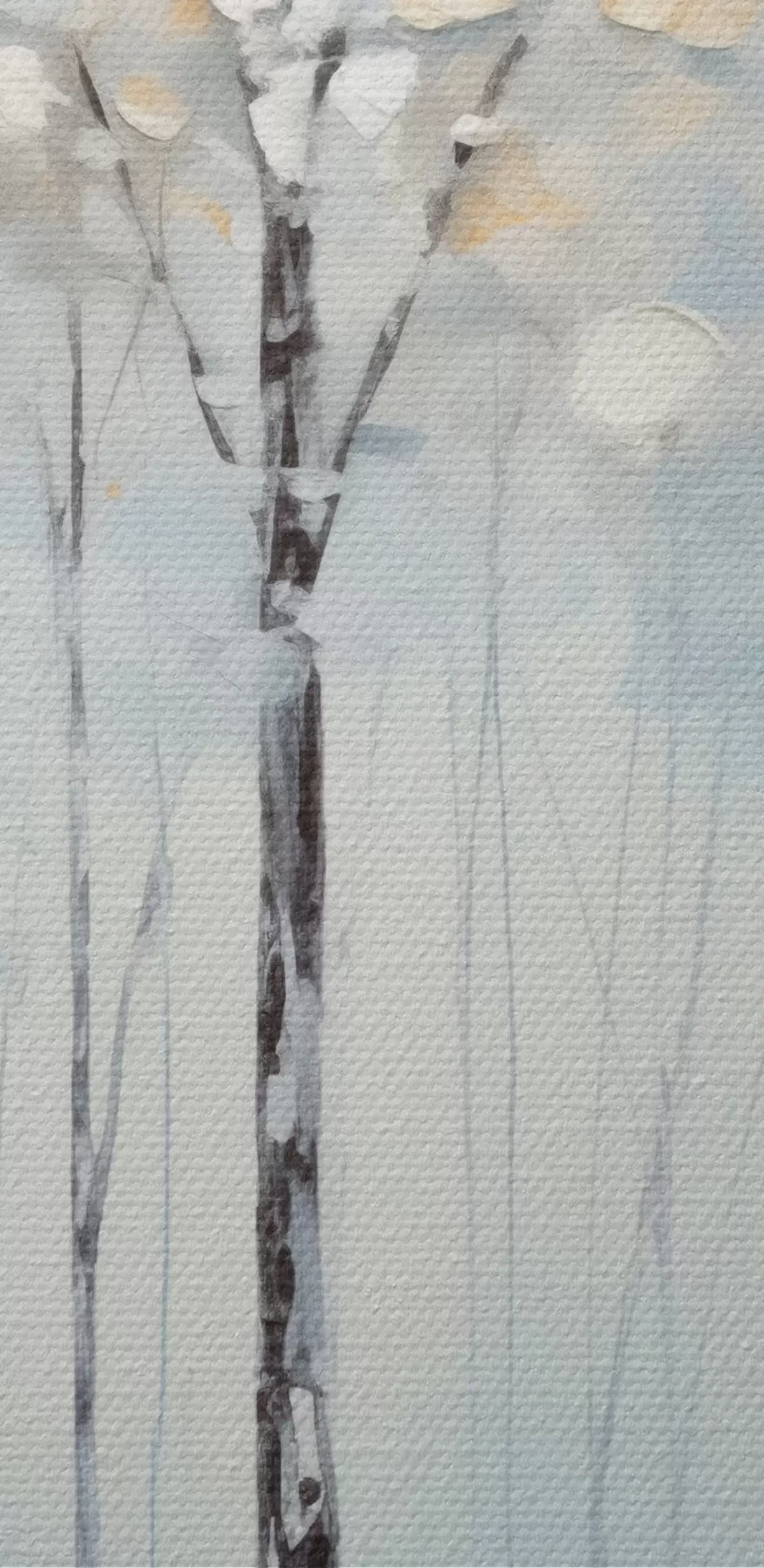 Obraz Wysokie, smukłe drzewa z niebieskimi liśćmi i odcieniami żółci na miękkim niebieskim tle, imitacja obrazu olejnego s42731