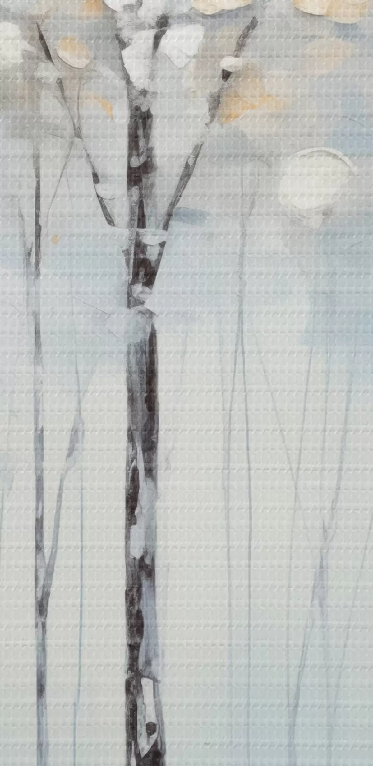 Obraz Wysokie, smukłe drzewa z niebieskimi liśćmi i odcieniami żółci na miękkim niebieskim tle, imitacja obrazu olejnego Nr s42731