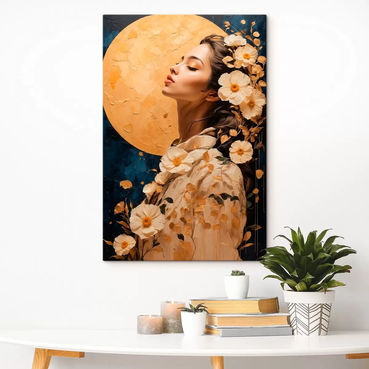 Obraz Dziewczyna z kwiatami na tle złotego księżyca s42774