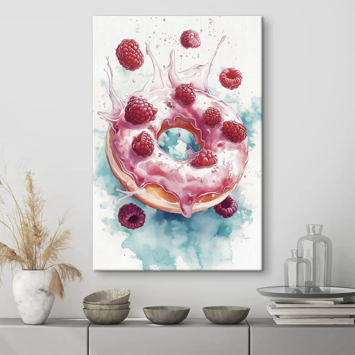 Obraz Akwarelowy donat z malinami, różowymi i niebieskimi kolorami Nr s42787