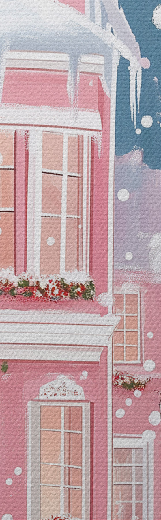 Obraz Zimowe miasto z różowymi domami, choinkami i płatkami śniegu Nr s42792
