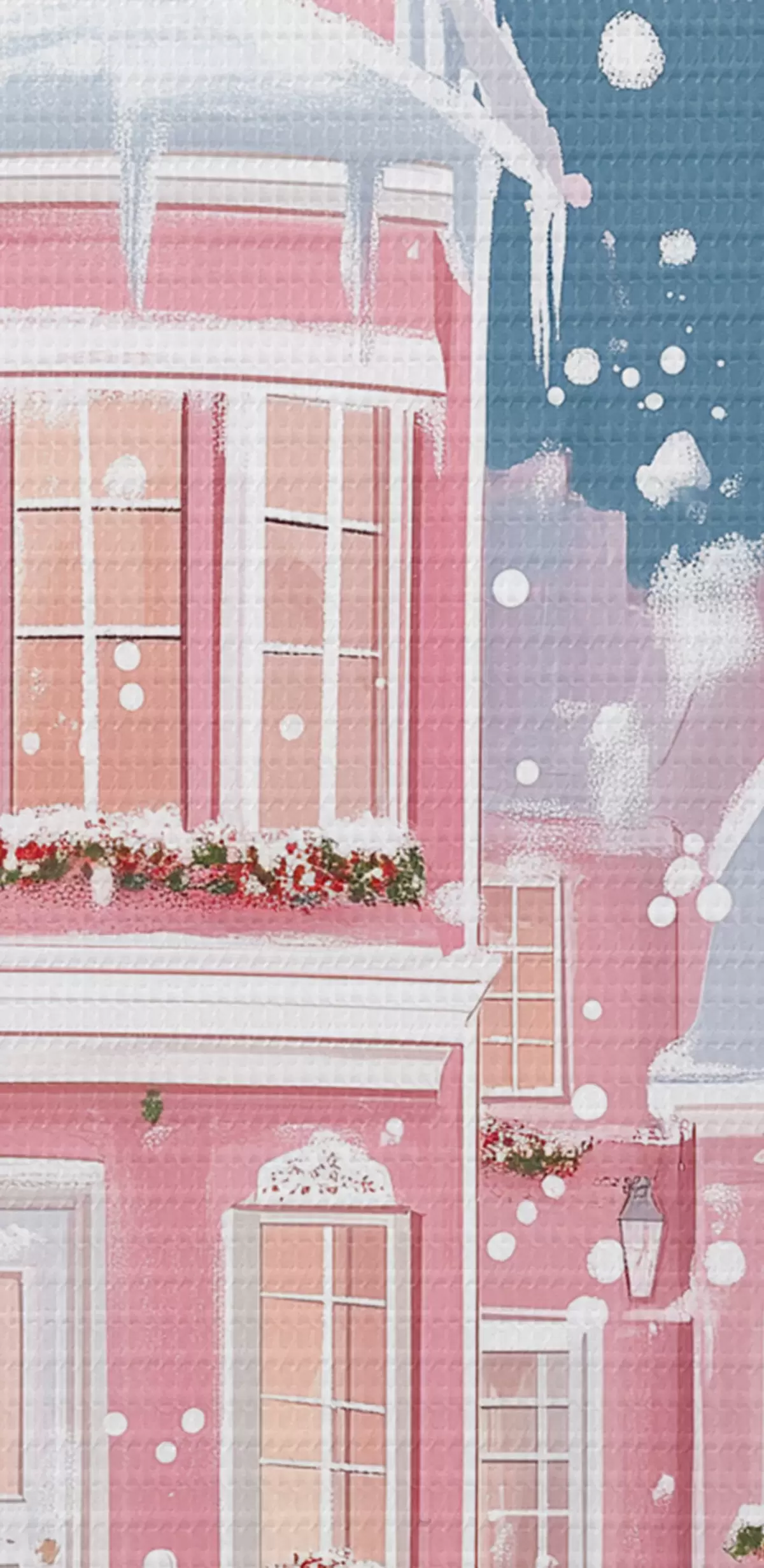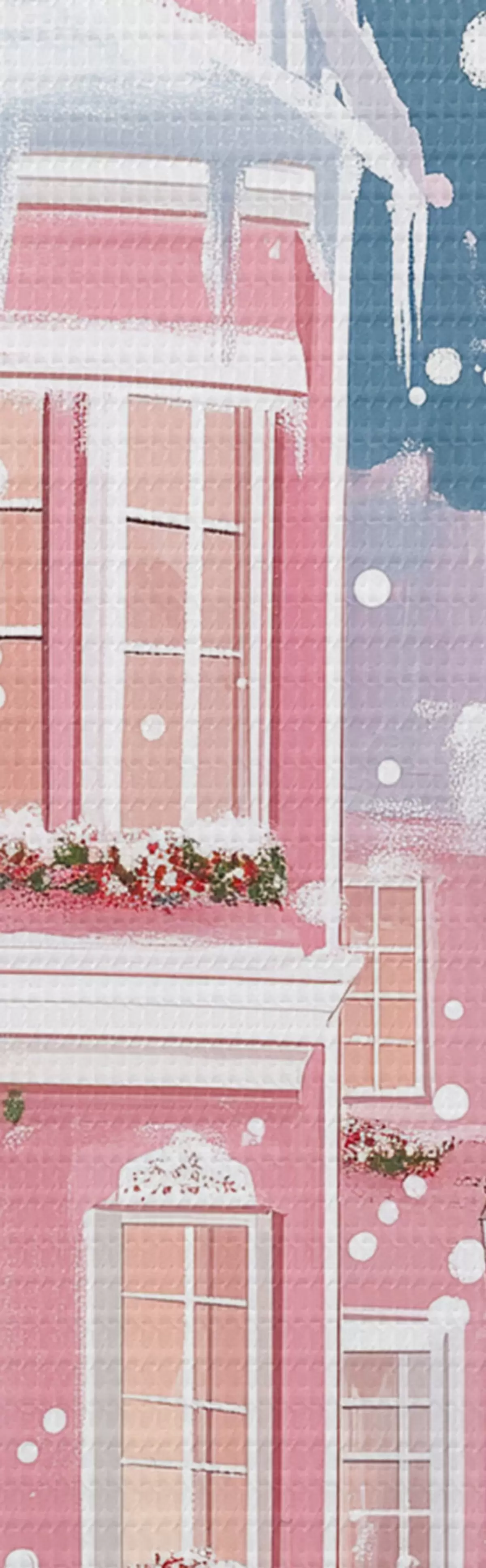 Obraz Zimowe miasto z różowymi domami, choinkami i płatkami śniegu  s42792