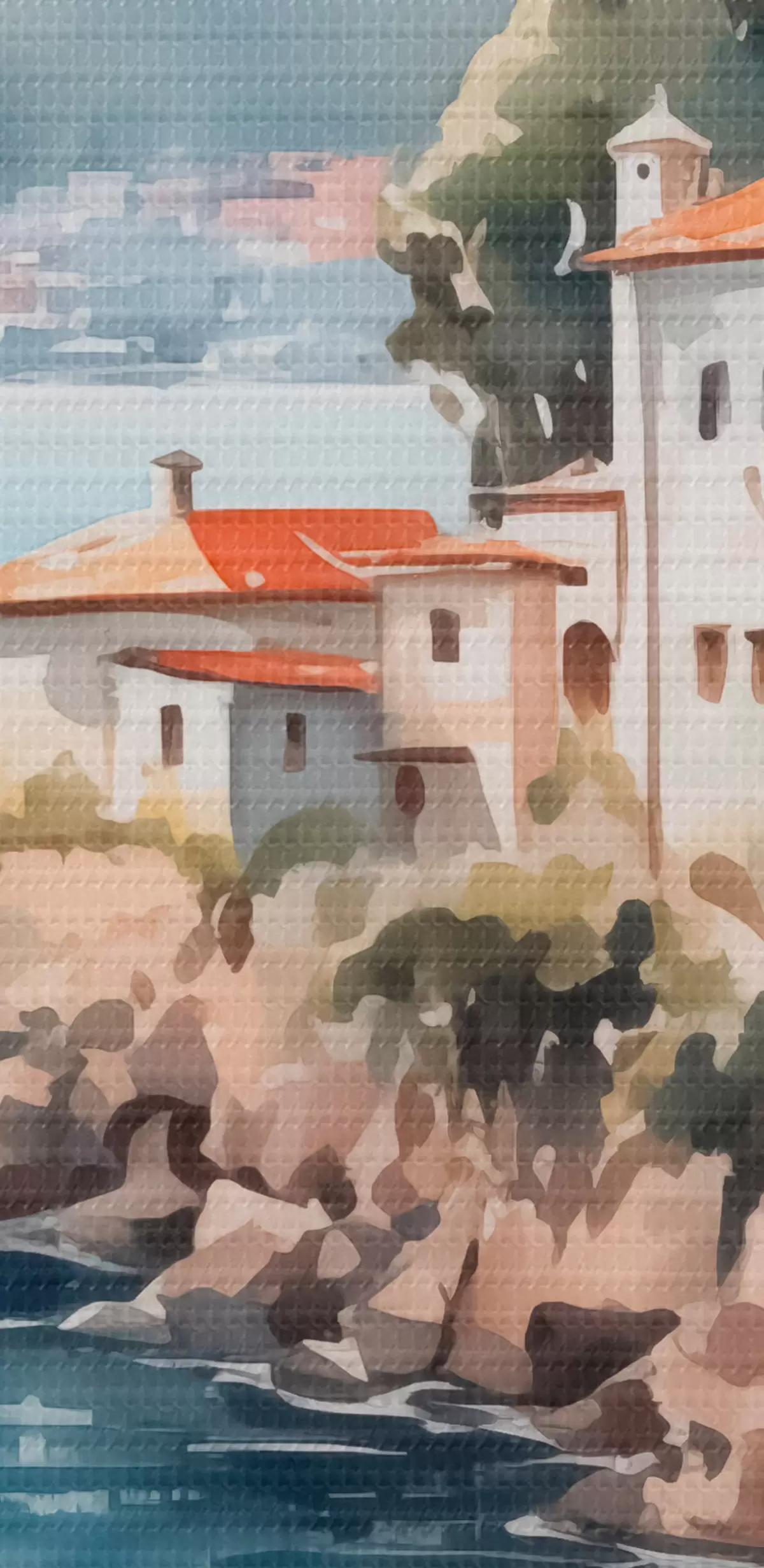 Obraz Kościół nad morzem z górami w tle Nr s42962
