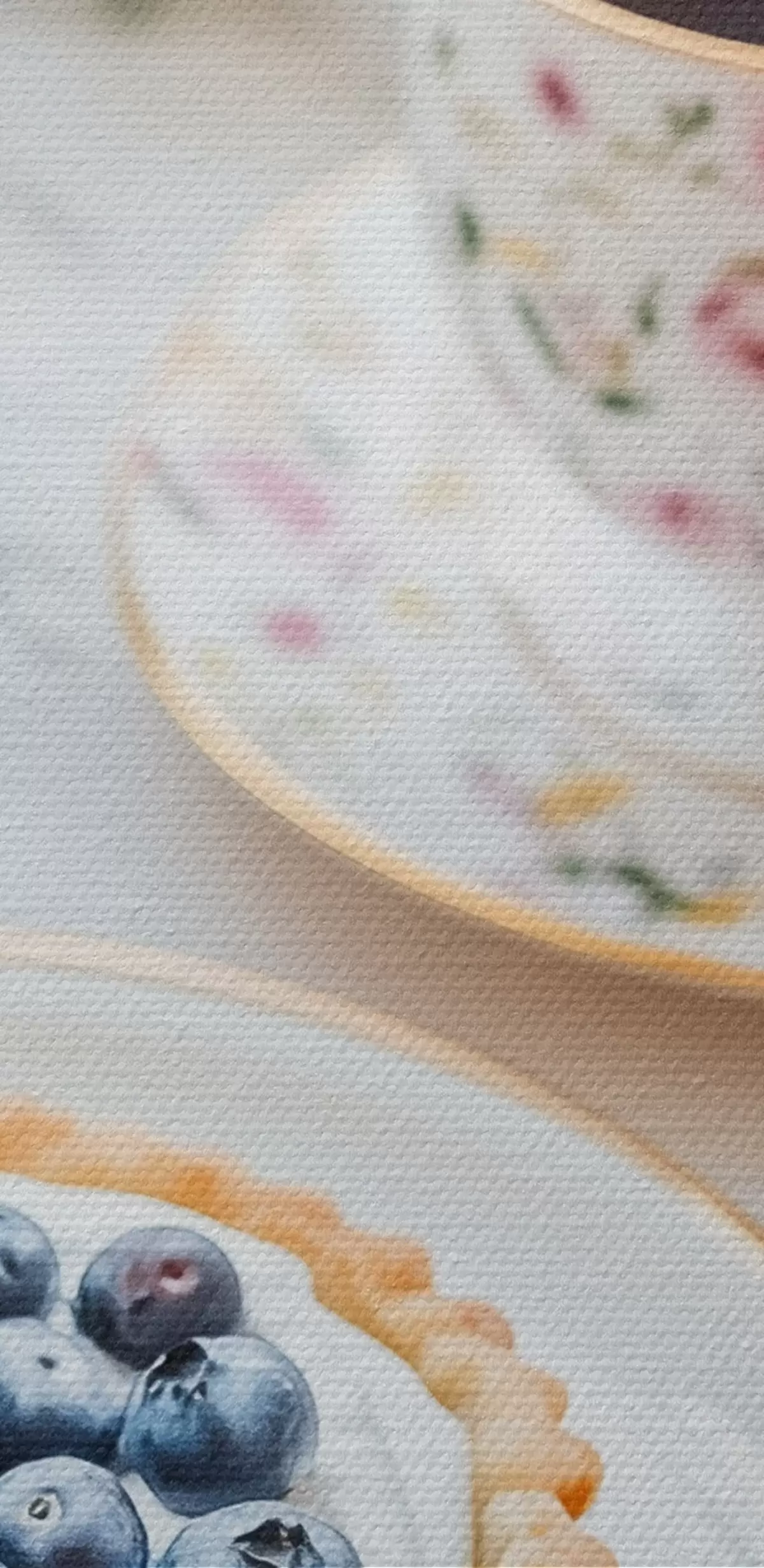 Obraz Babeczka jagodowa z filiżanką herbaty, styl boho, różowe róże Nr s43066
