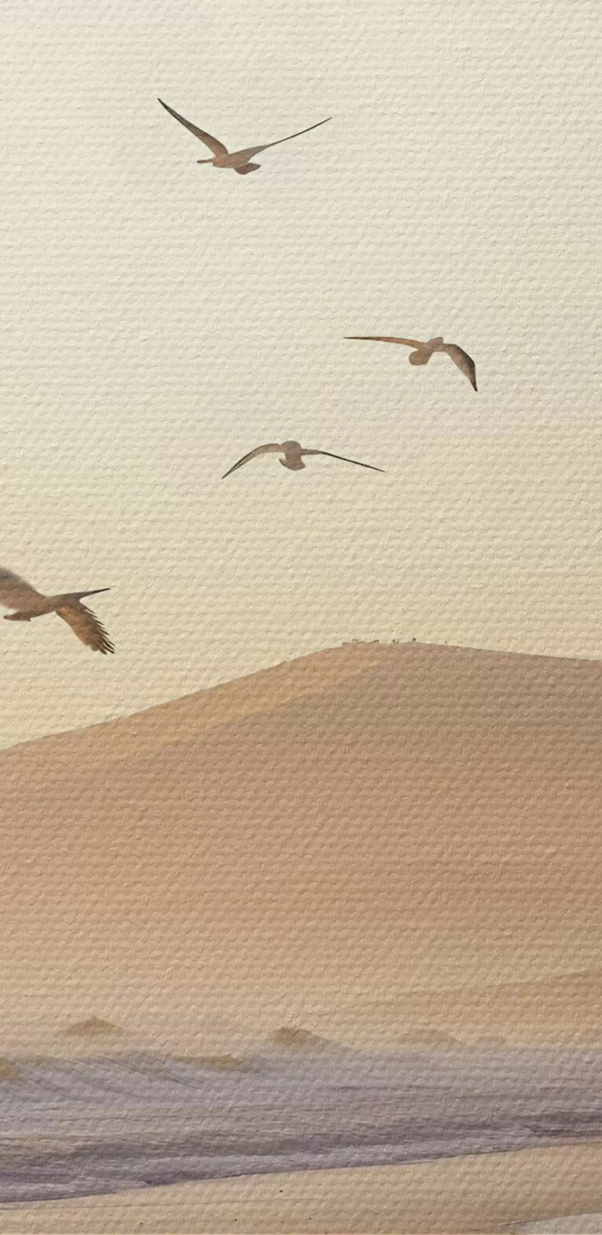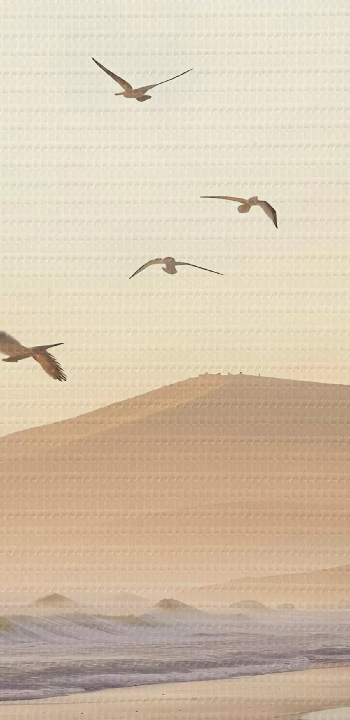 Obraz Ptaki latające nad plażą z oceanem, góry w tle, ciepłe kolory, miękka pastelowa paleta  s43162