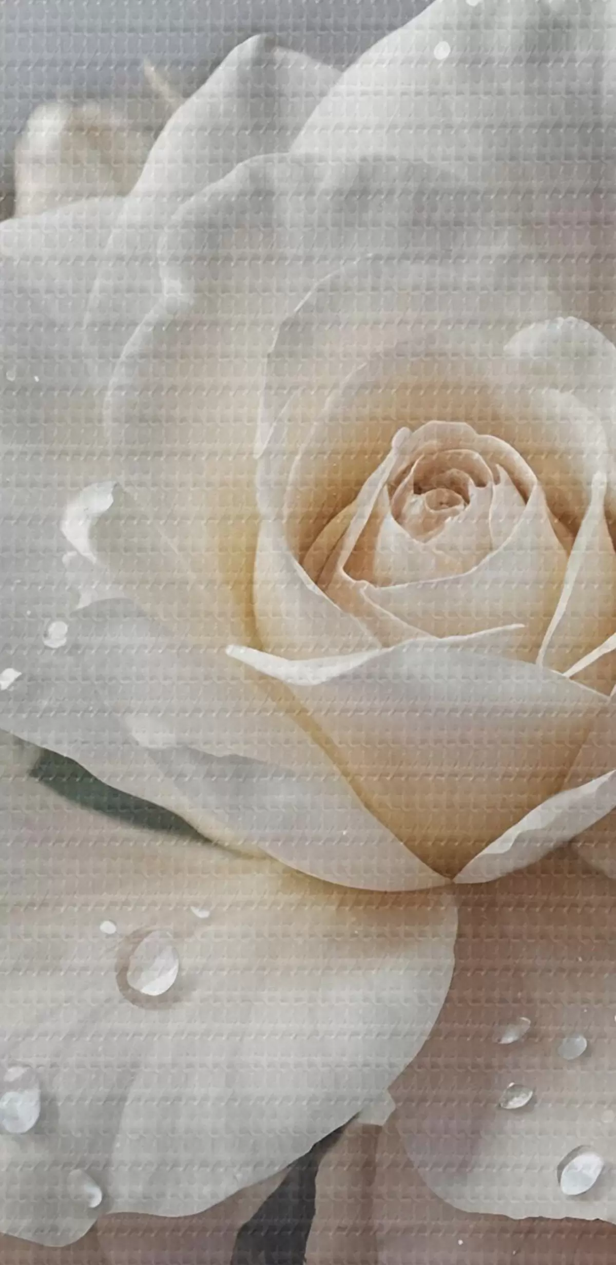 Obraz Grupa białych róż z kroplami wody na płatkach, kilka zielonych liści, stonowane tło, miękkie światło Nr s43163