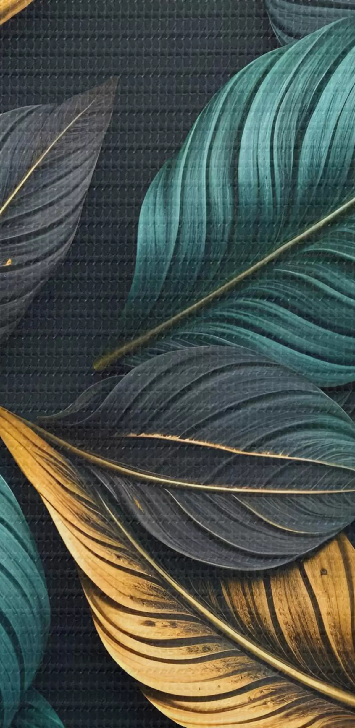 Obraz Ciemnozielone, żółte i czarne liście z ciemnymi żyłkami, na ciemnym tle, elegancki tropikalny klimat Nr s43164