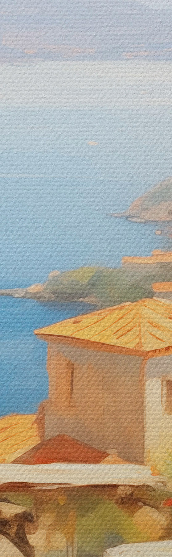 Obraz Obraz olejny imitacja balkonu z kwiatami, z widokiem na morze, domy na wybrzeżu, słoneczny dzień, błękitne niebo s43173