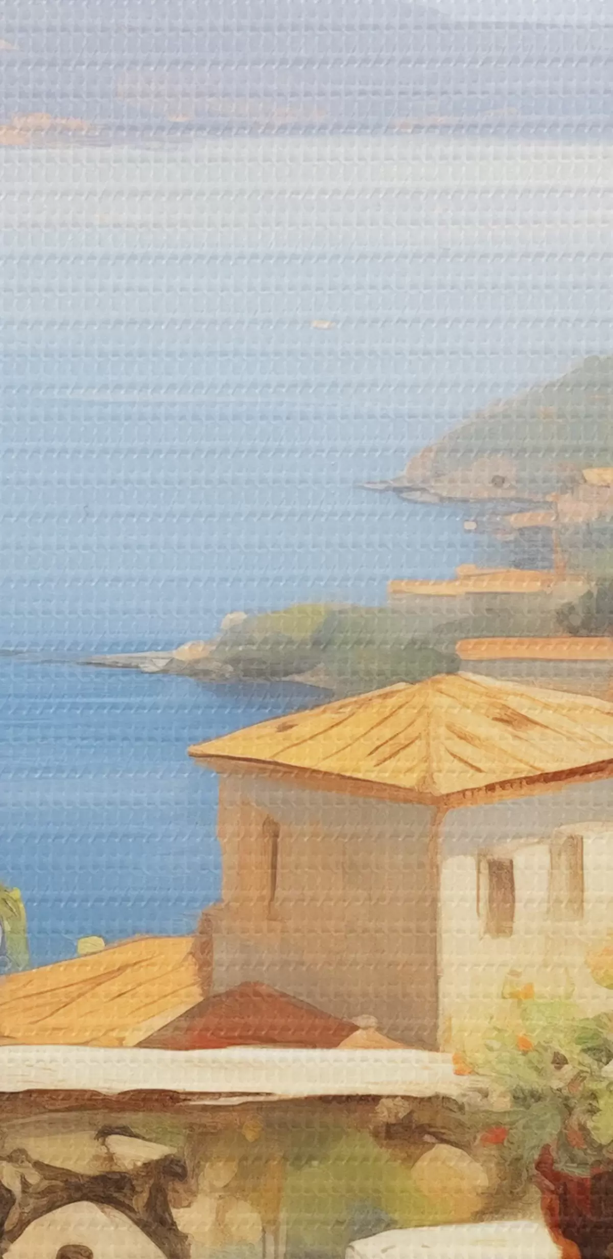 Obraz Obraz olejny imitacja balkonu z kwiatami, z widokiem na morze, domy na wybrzeżu, słoneczny dzień, błękitne niebo Nr s43173