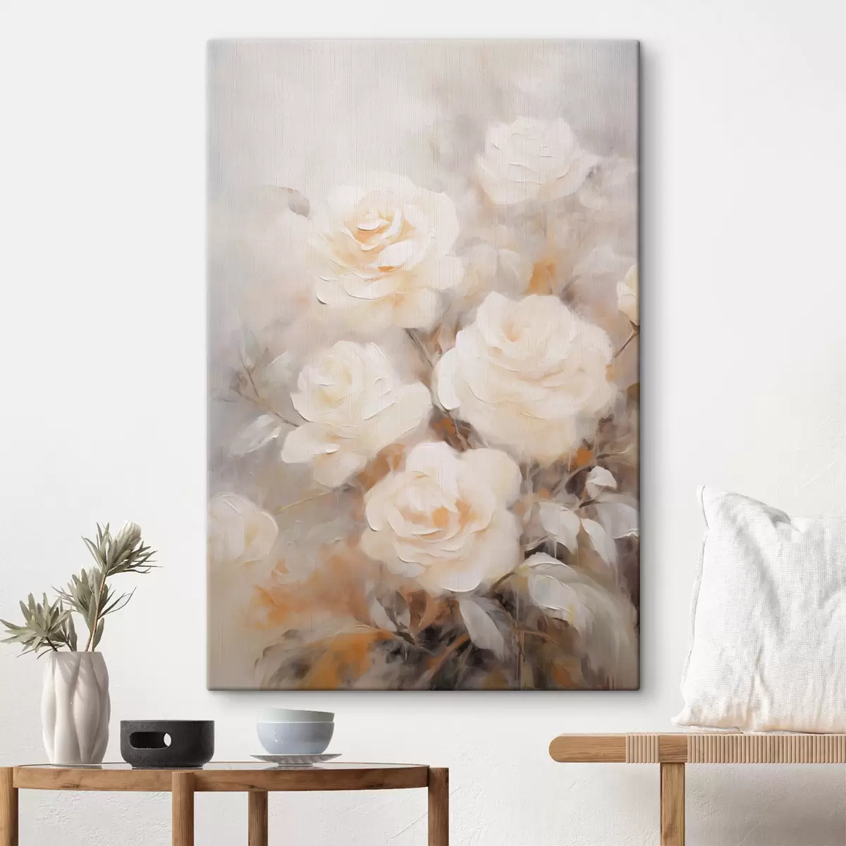 Obraz Białe róże z delikatnymi płatkami, na tle stonowanych kolorów i rozmytych kształtów, tworzące marzycielski efekt Nr s43177