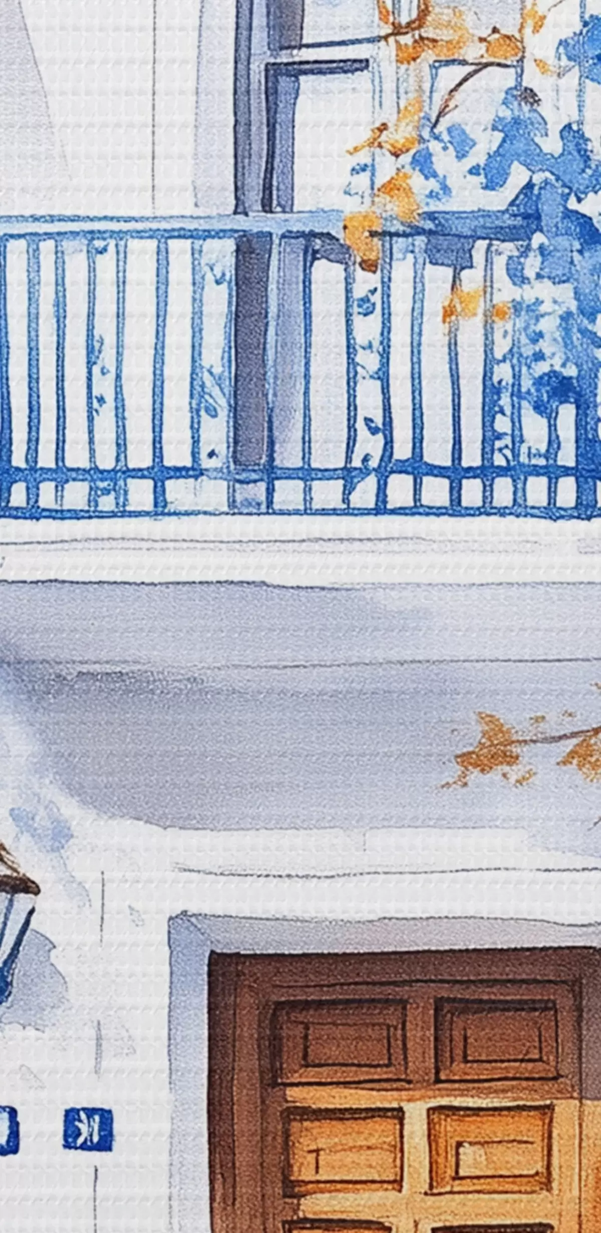 Obraz Kwitnące drzewo z niebieskimi kwiatami, biały dom, Grecja, styl akwareli s43183