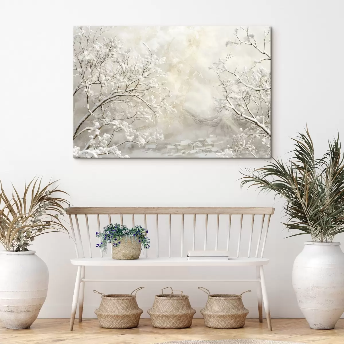 Obraz Zimowe gałęzie ze śniegiem na tle zimowej wioski Nr s43321
