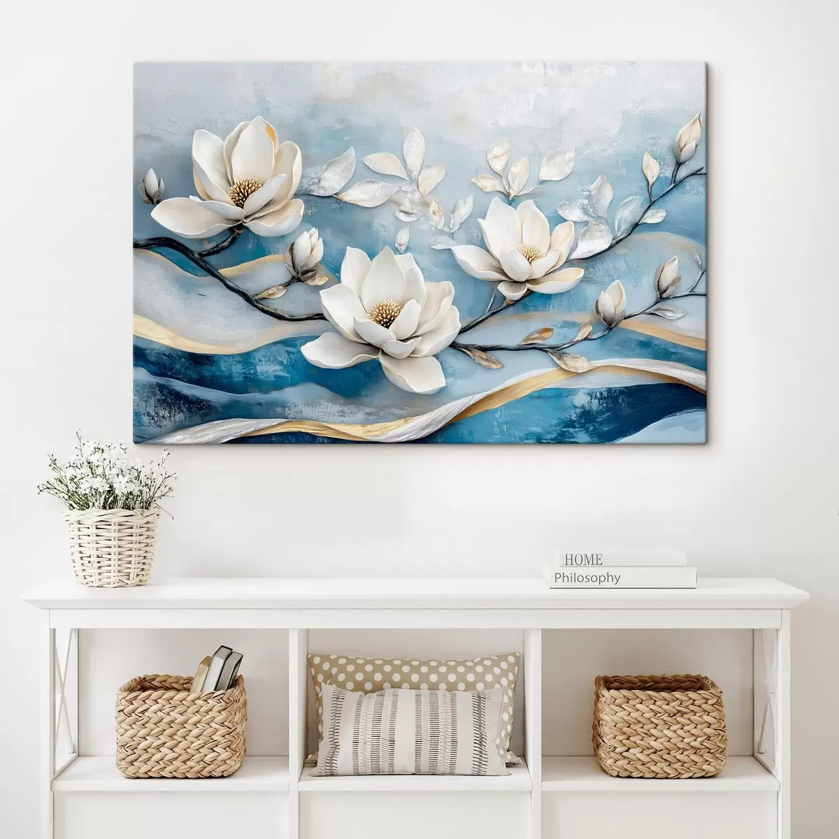 Obraz Gałązka magnolii na abstrakcyjnym niebiesko-żółtym tle Nr s43323