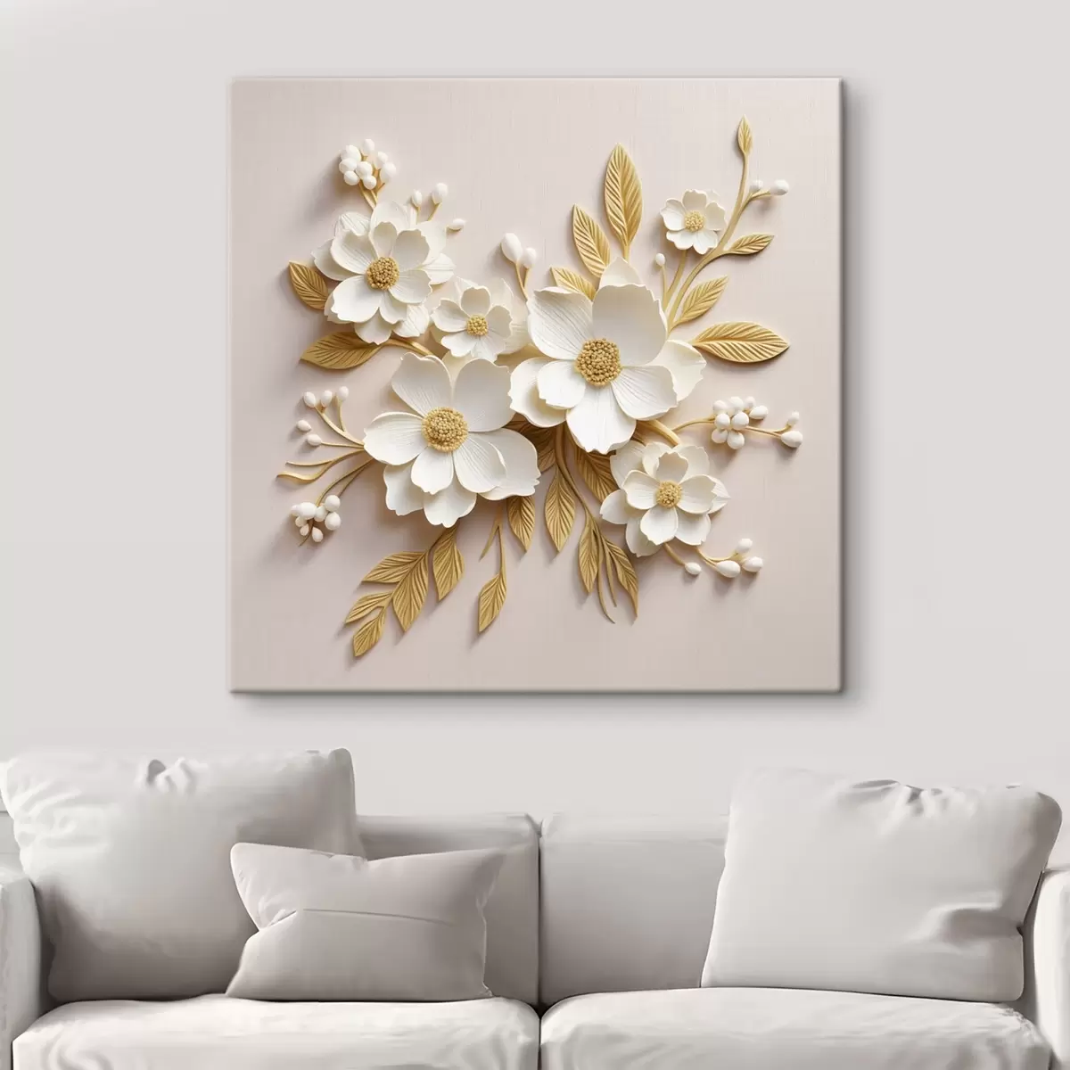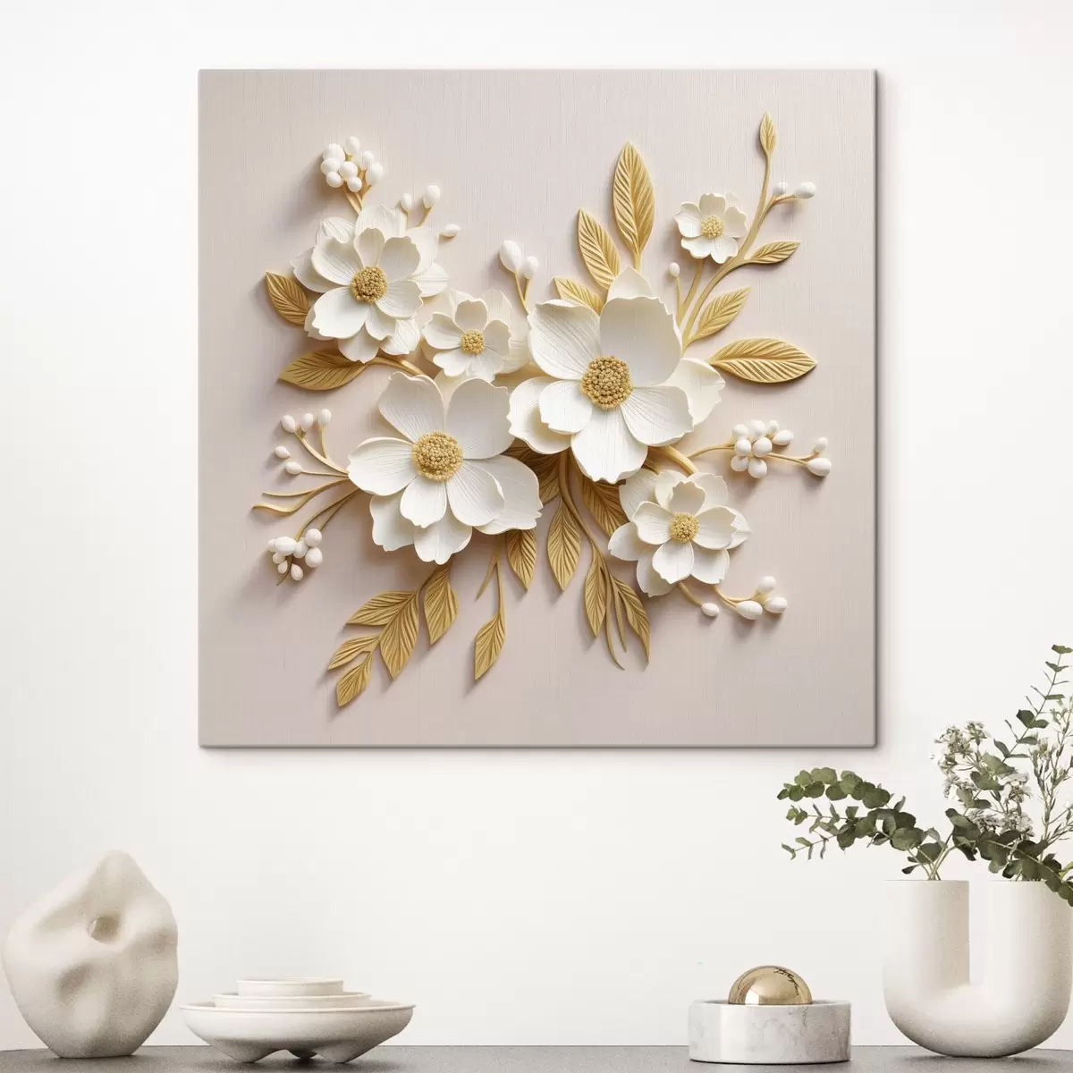 Obraz białe kwiaty 3D z liśćmi na kremowym tle Nr s43383