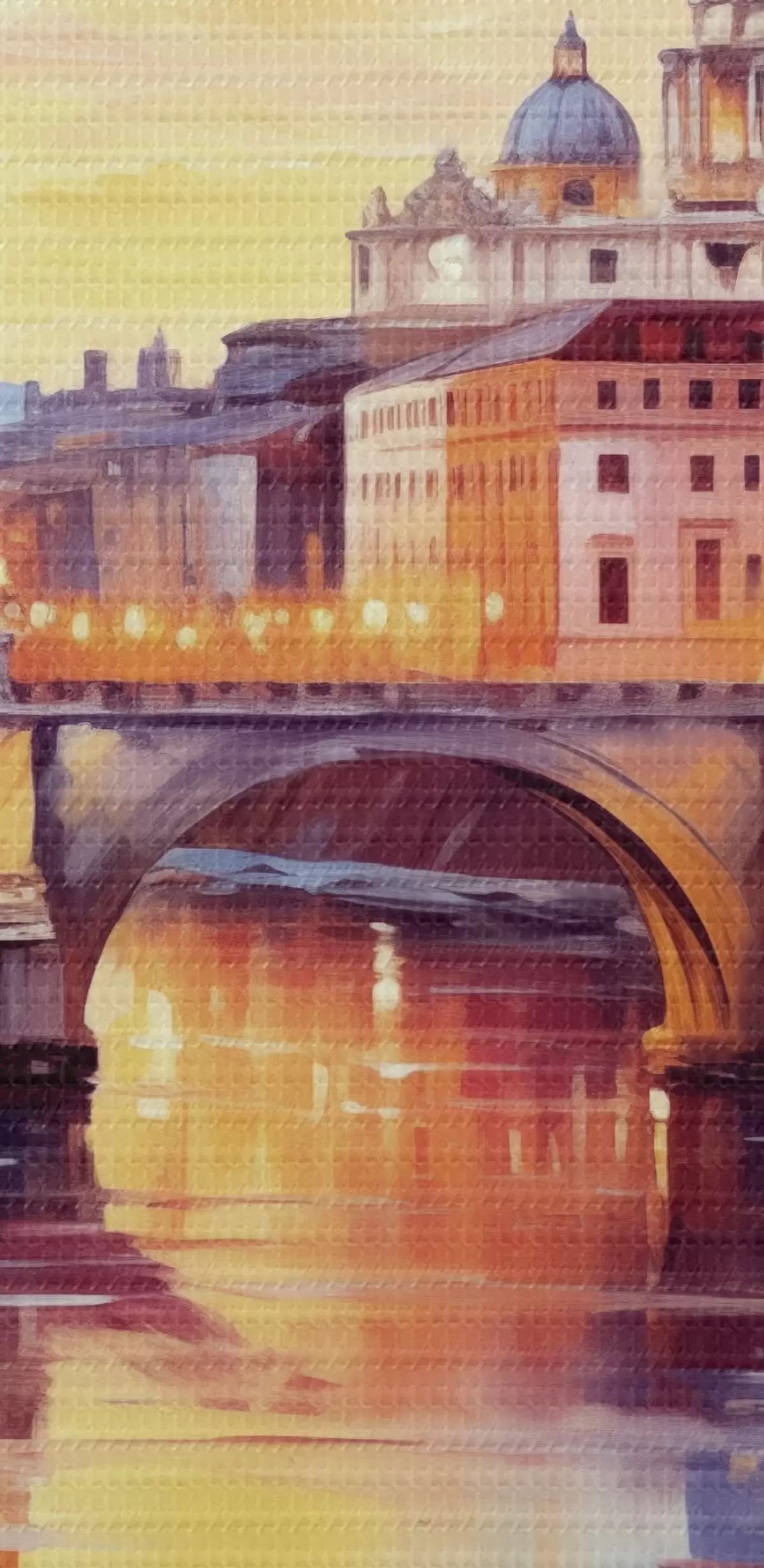 Obraz Bazylika Świętego Piotra i most nad rzeką o zachodzie słońca, ciepłe kolory, odbicie w wodzie, styl malarstwa olejnego Nr s43396
