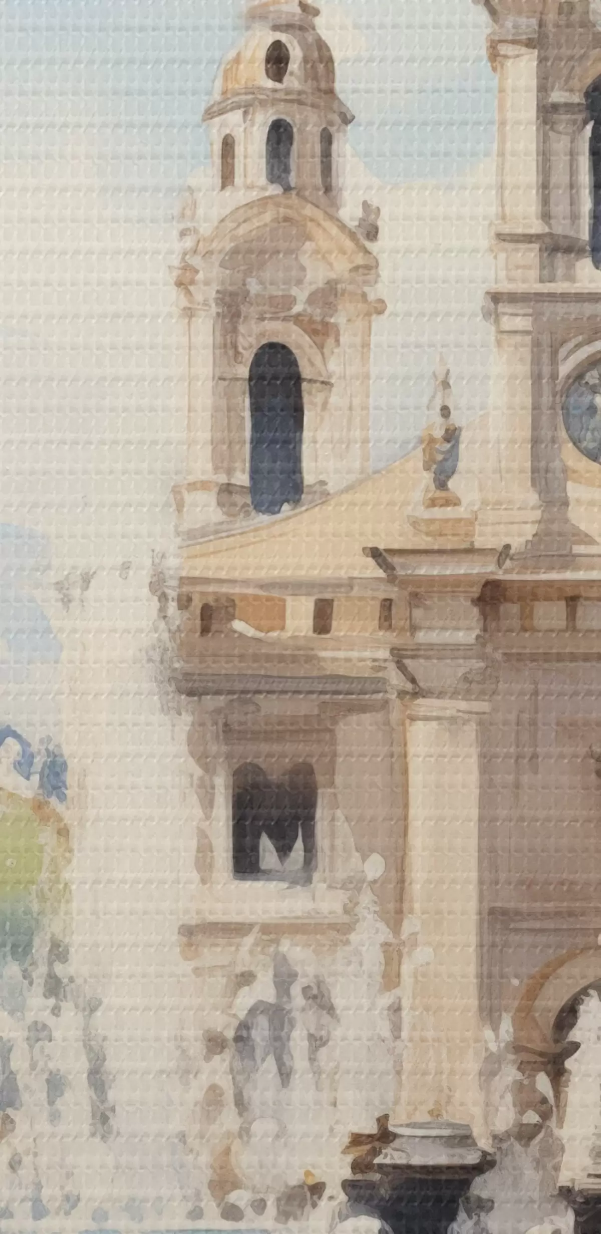 Obraz Abstrakcyjny pejzaż miejski z wieżą i fontanną na rynku, góry w oddali, styl akwareli Nr s43397