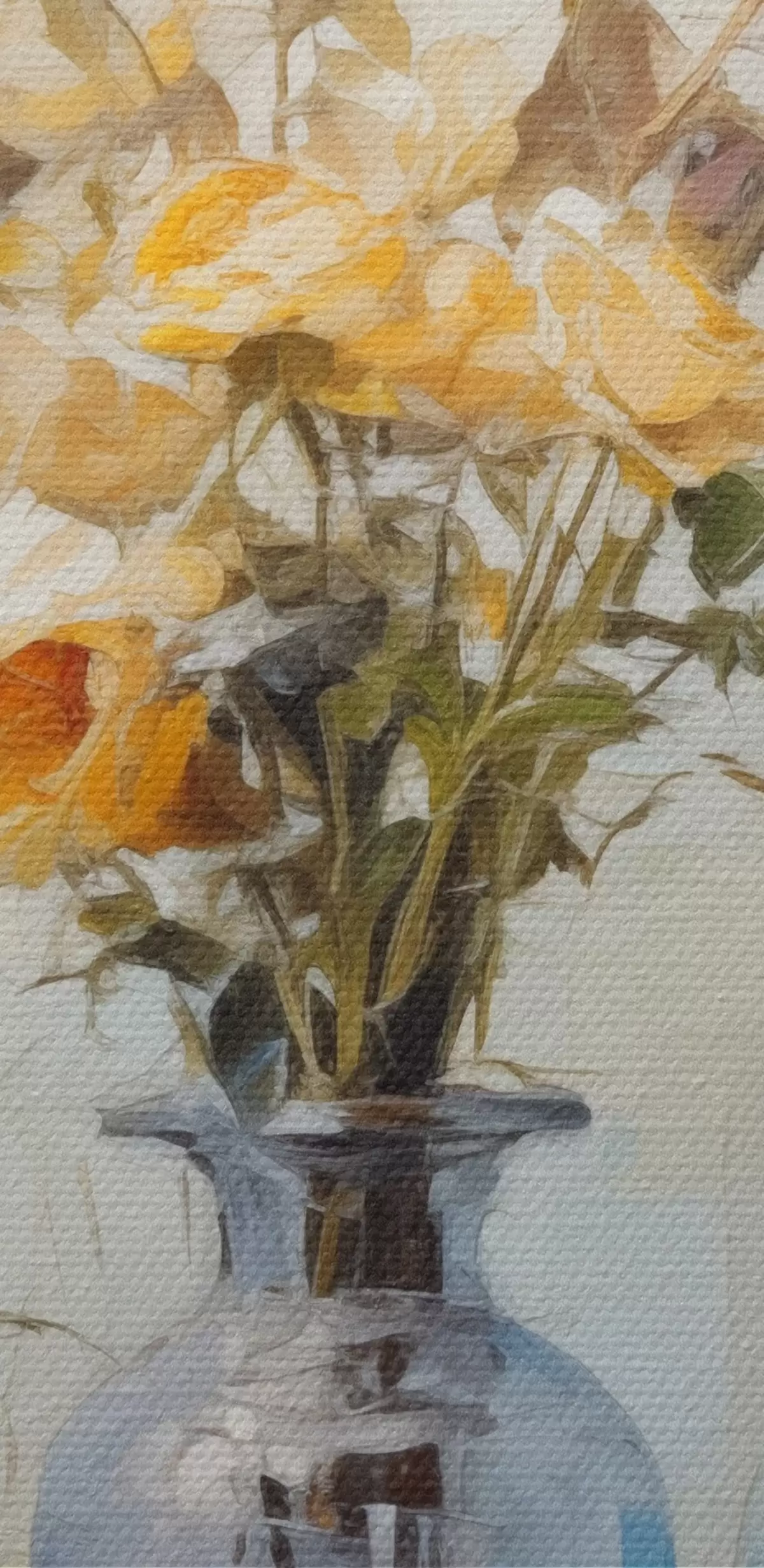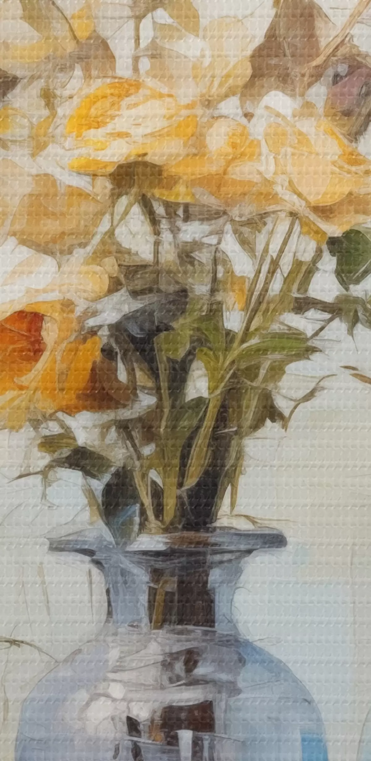 Obraz Martwa natura z żółtymi różami w niebieskich szklanych wazonach, jasne teksturowane tło, miękkie pociągnięcia pędzla, styl malarstwa olejnego Nr s43409