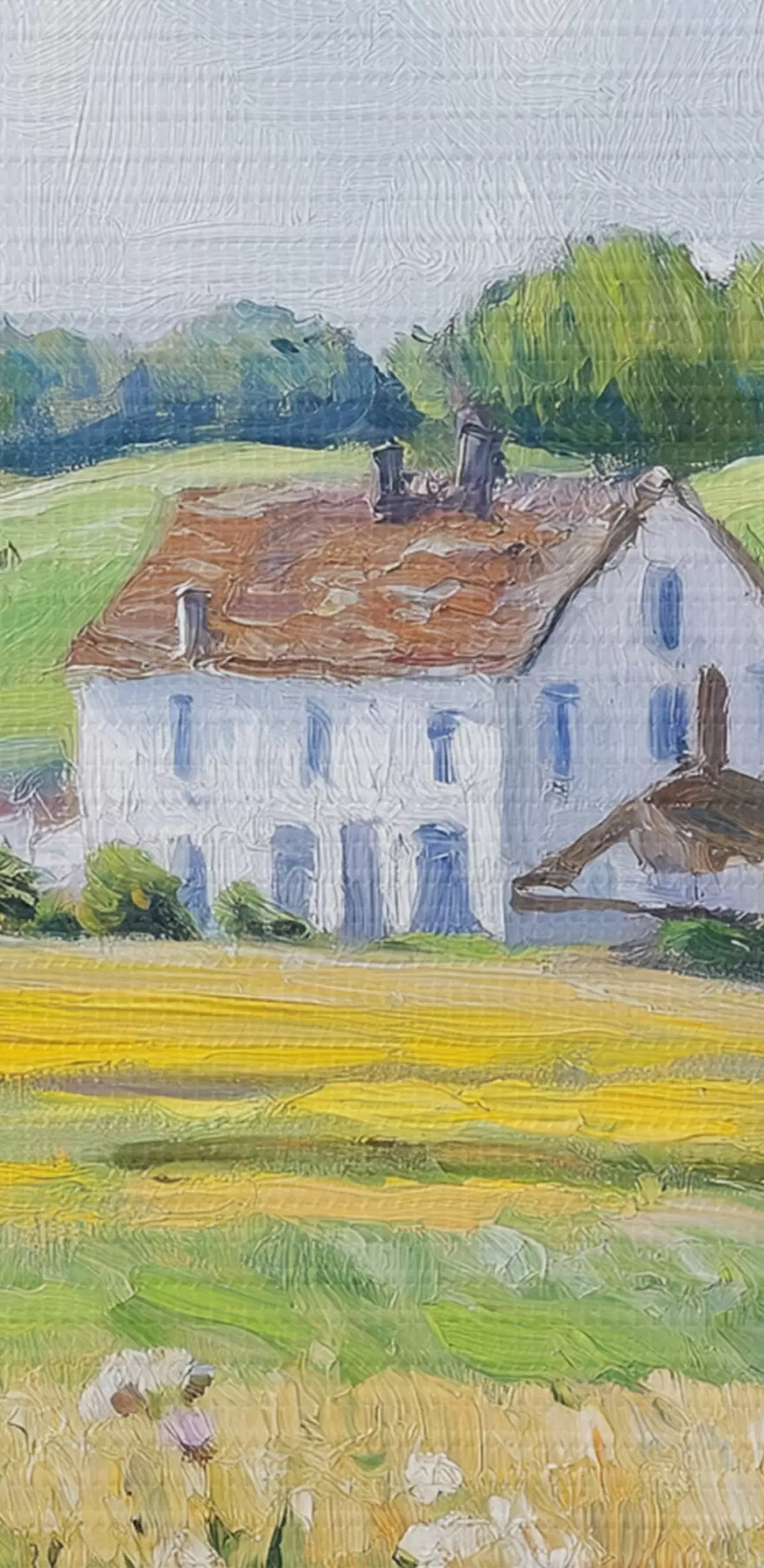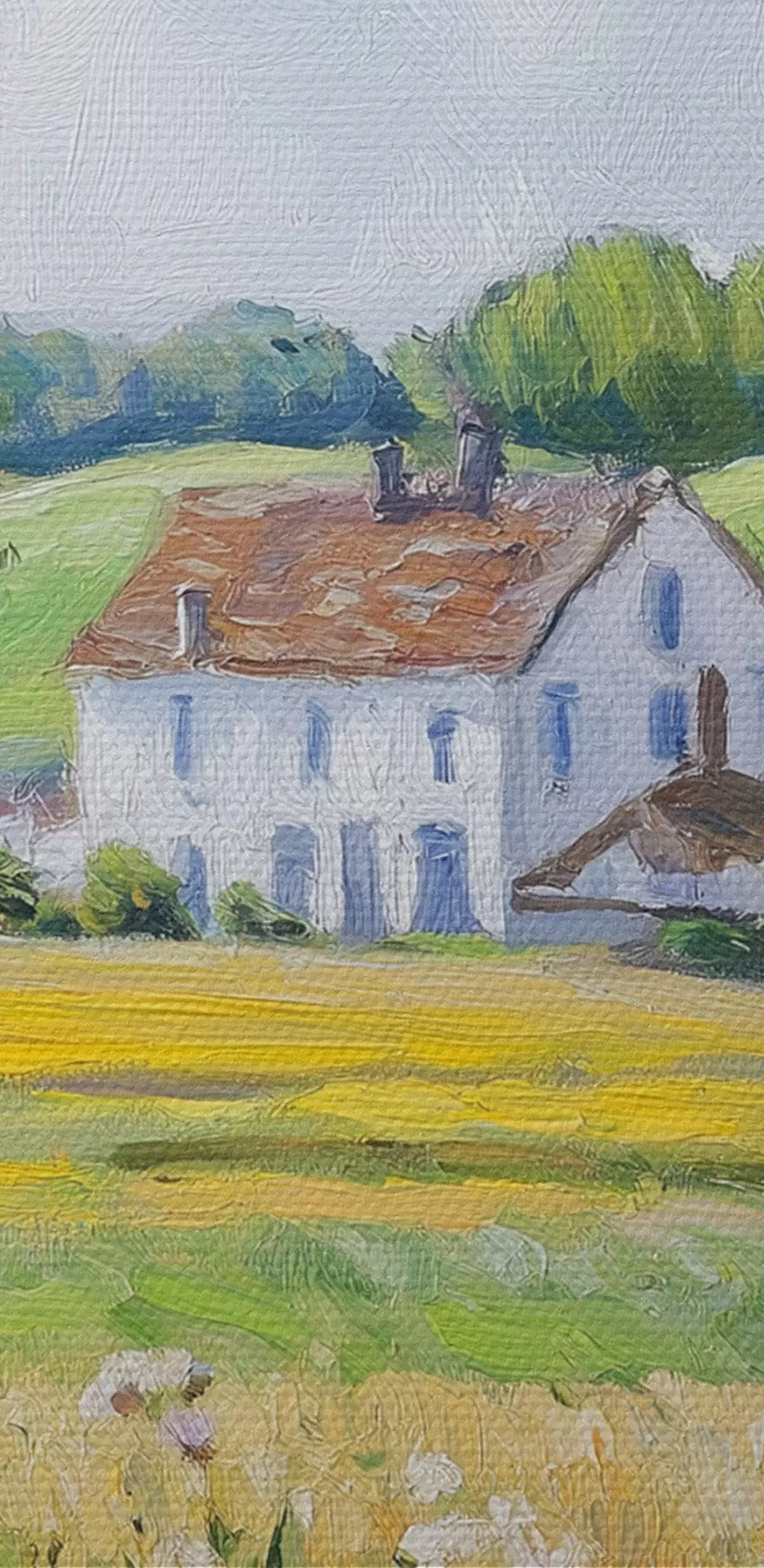 Obraz Wiejskie krajobrazy w drewnianym oknie, kwiaty, pola, styl olejny, dom wiejski s43888