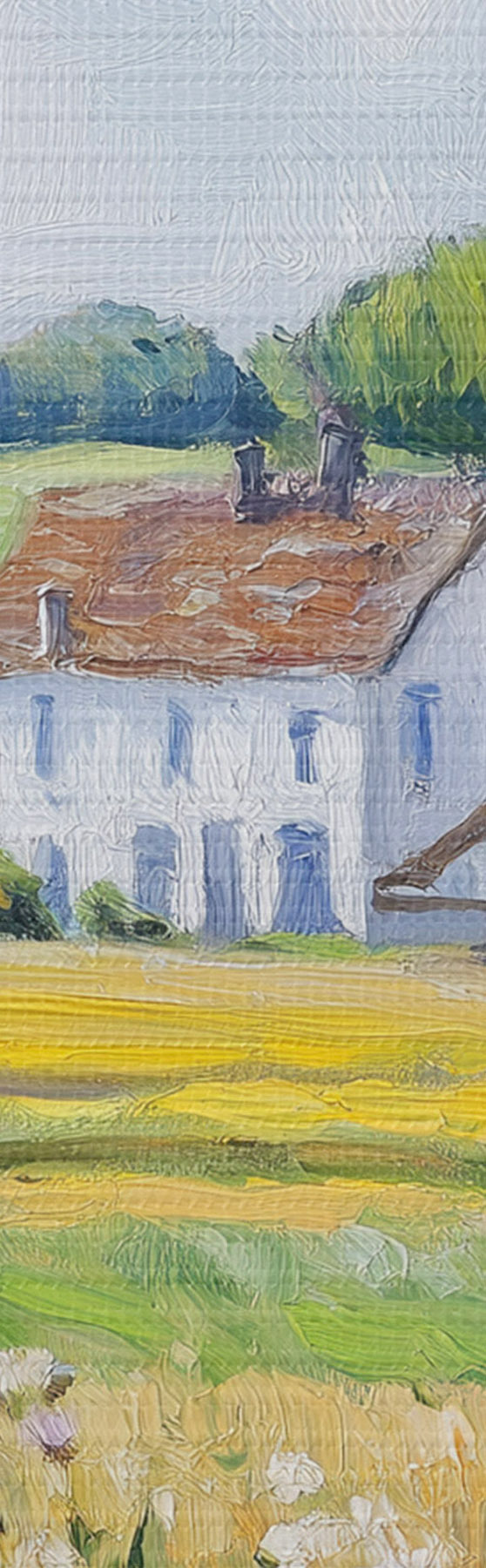 Obraz Wiejskie krajobrazy w drewnianym oknie, kwiaty, pola, styl olejny, dom wiejski Nr s43888