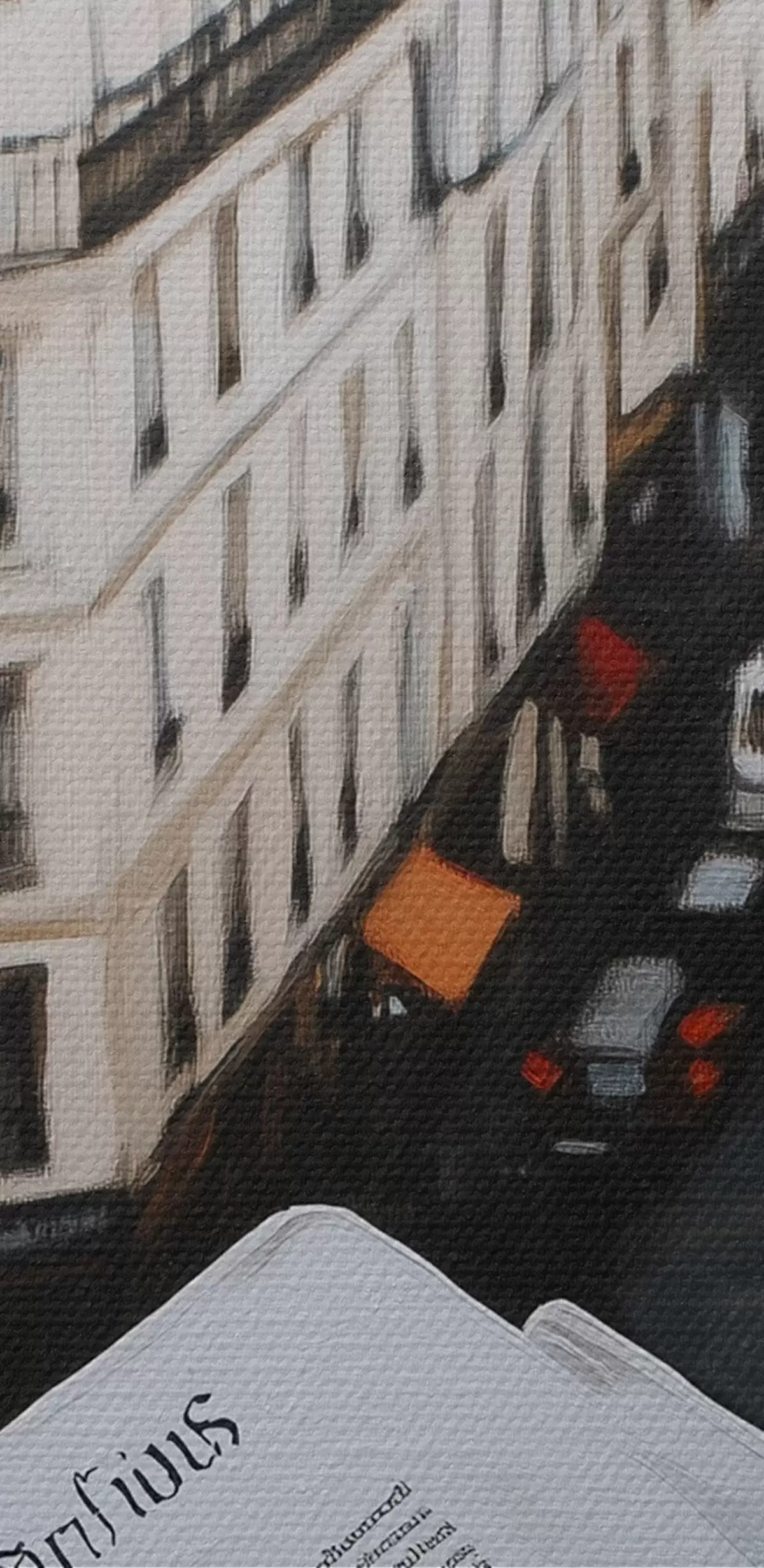 Obraz Poranna kawa z rogalikami, ulica miasta, architektura, styl olejny s43891