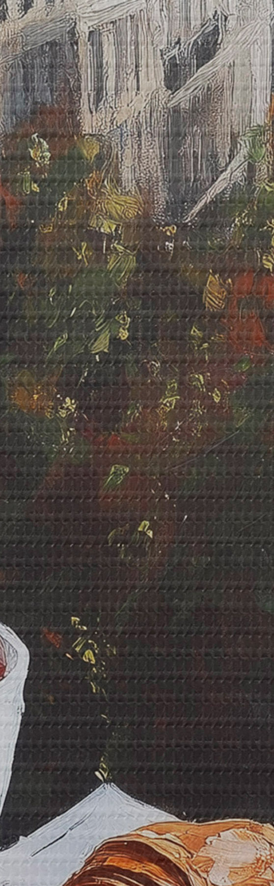 Obraz można delikatnie przetrzeć suchą, miękką szmatką lub gąbką; nie zaleca się używania mokrych produktów. Użycie wilgotnej gąbki jest dozwolone tylko wtedy, gdy obraz został polakierowany.