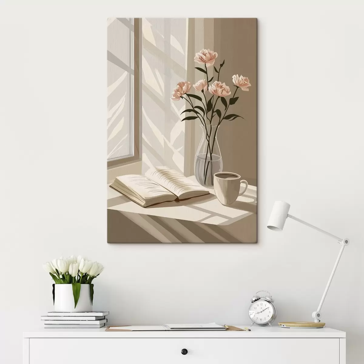 Obraz Przytulny poranek z kawą i książką, różowe kwiaty, abstrakcja s44013